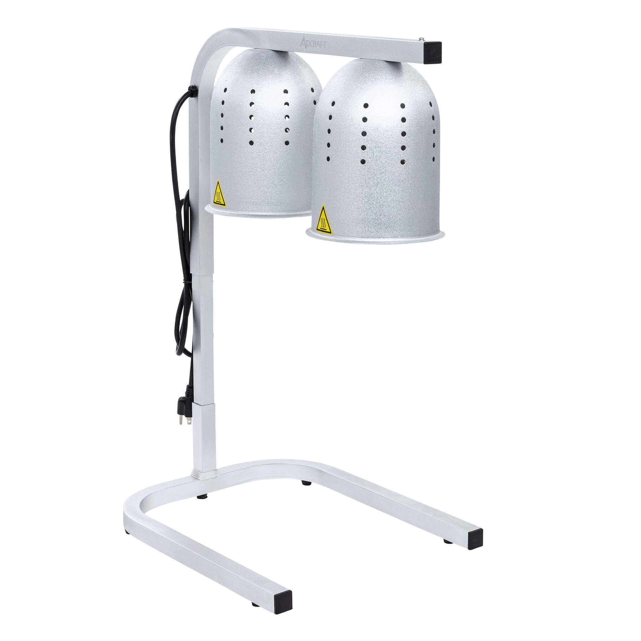 Culinary Innovation at Your Service! Introducing the Adcraft - Admiral Craft Equipment HL-2 Heat Lamp. Designed for commercial restaurant use, this heat lamp is a game-changer in food presentation. With its adjustable C-frame and flared rim shades, you can easily direct the heat exactly where it's needed, ensuring your dishes stay warm and appetizing. The lamp features two food-safe clear bulbs, providing ample illumination to showcase your culinary creations. Its ceramic insulated sockets with nickel plated contacts guarantee safe and reliable operation. Made of durable aluminum, this freestanding heat lamp is built to withstand the demands of a busy kitchen. The on/off switch allows for easy control, while the 120v/60/1-ph power supply ensures compatibility with standard outlets. With a sleek design and certifications from cETLus, UL EPH, ANSI/NSF 4, CSA, and CE, the Adcraft - Admiral Craft Equipment HL-2 Heat Lamp is the perfect addition to any commercial restaurant seeking to elevate their food presentation and keep customers coming back for more.
