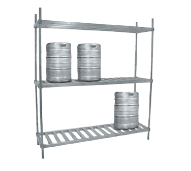 Featuring three shelves, this keg rack can accommodate up to eight kegs tightly, optimizing your storage space. The mid and bottom shelves are constructed of 1-3/4" square tubing running front to back, each with a load rating of 60 lb per square foot, providing exceptional strength and durability. The top shelf, designed with 1-3/4" square tubing running left to right, has a load rating of 15 lb per square foot, making it ideal for lighter items.
