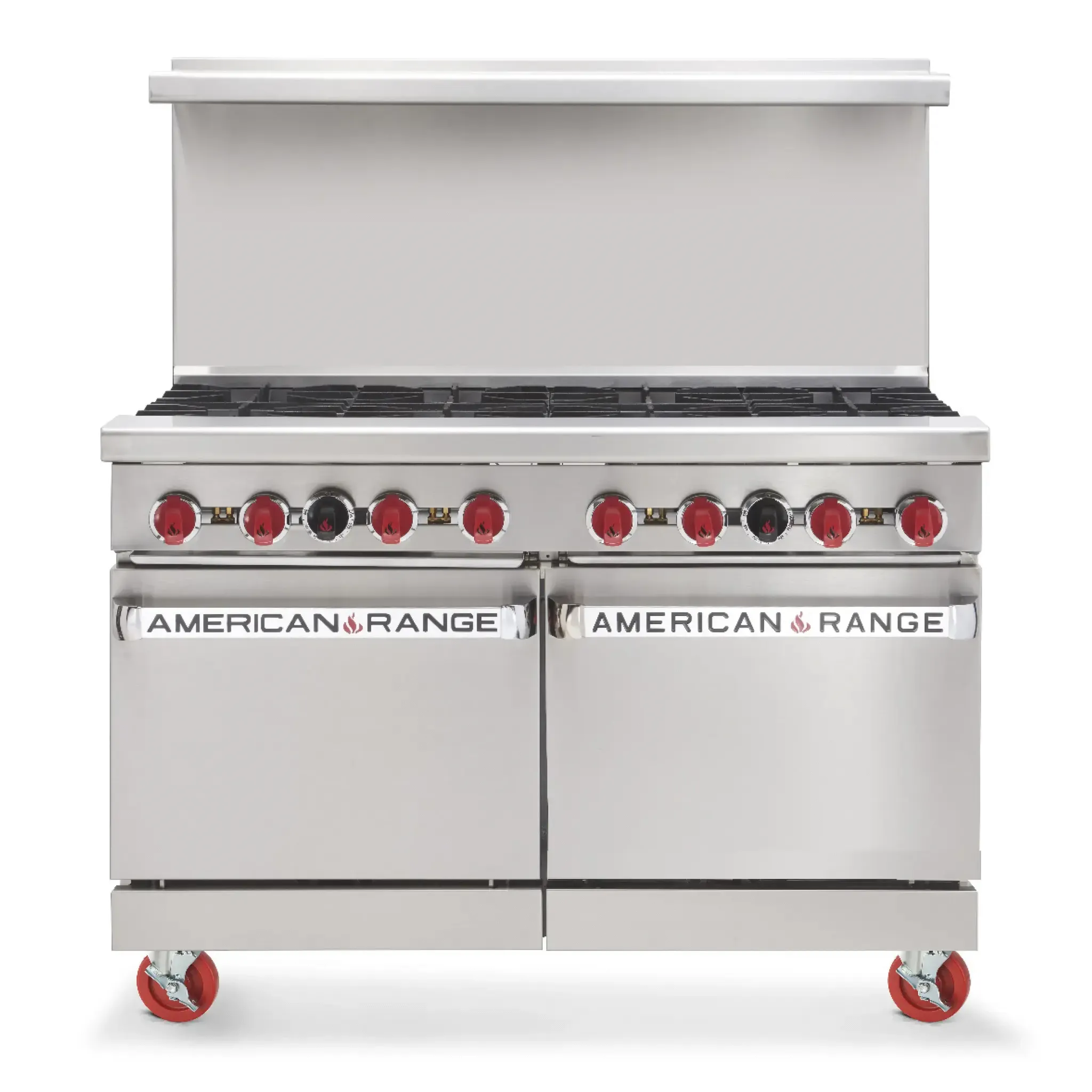 Cook with flair using top-quality equipment with the American Range AR-24G-4B Range. This heavy-duty restaurant range is designed for commercial restaurant use, delivering exceptional performance and durability. With four 32,000 BTU open burners and a 24" griddle with a 5/8" thick plate, this range offers versatile cooking options to meet the demands of any busy kitchen. The manual controls allow for precise temperature adjustments, ensuring consistent results every time. The two 20" space saver ovens provide ample cooking space, with one rack per oven for efficient baking. Made in the USA and ETL-Sanitation certified, this range is built to last and meets the highest standards of quality and safety. The stainless steel front, sides, and high shelf not only add a sleek and professional look but also make cleaning a breeze. Elevate your restaurant's culinary offerings with the American Range AR-24G-4B Range.