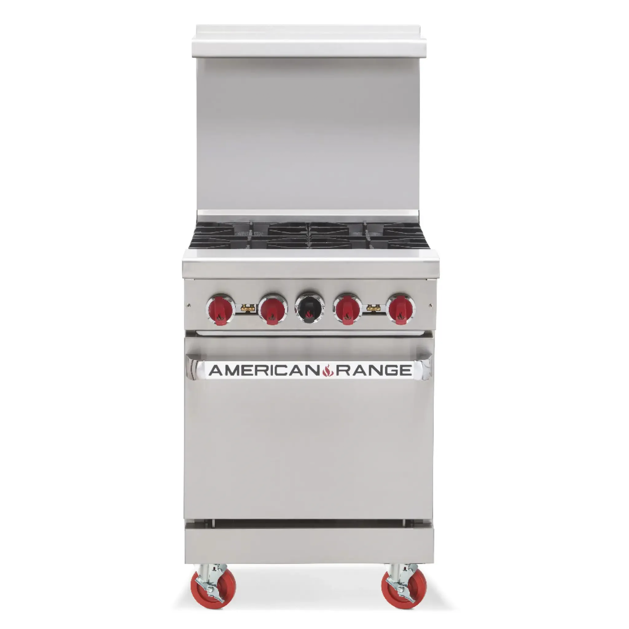 Cook with flair using top-quality equipment with the American Range AR-24G Gas Restaurant Range. This heavy-duty range is designed specifically for commercial restaurant use, ensuring durability and reliability in a fast-paced kitchen environment. The 24" griddle features a 5/8" thick plate, perfect for cooking a variety of dishes with consistent heat distribution. The manual controls allow for precise temperature adjustments, giving chefs full control over their culinary creations. The range also includes a space-saving 20" oven with a rack, providing additional cooking options. Made in the USA with stainless steel front, sides, and high shelf, this range is not only stylish but also easy to clean and maintain. With 6" adjustable chrome plated legs, it can be customized to fit any kitchen layout. Trust American Range for top-notch quality and performance in your restaurant kitchen.
