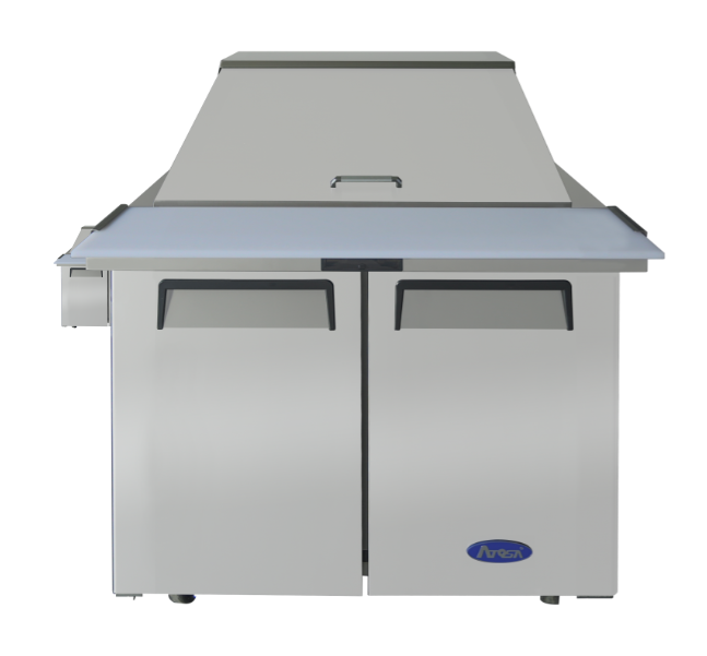 Mobilize your kitchen with the Atosa USA, MSF3615GR Sandwich Prep Table. This two-section mega top refrigerator is designed to meet the demands of a busy commercial restaurant. With its spacious 8.7 cu. ft. capacity, it includes 15 stainless steel pans for easy organization and access to your sandwich and salad ingredients. The rear-mounted, self-contained refrigeration system ensures efficient cooling, while the digital temperature control allows you to set the perfect temperature between 33° to 40°F. The two solid hinged self-closing doors and adjustable shelves provide convenient storage options. The 10" poly cutting board offers a convenient workspace for food preparation. Made with a stainless steel interior and exterior, as well as a galvanized steel back, this prep table is built to withstand the rigors of a commercial kitchen. With its automatic evaporation and air defrost features, maintenance is a breeze. The 5" casters make it easy to move and clean the unit. Trust Atosa USA to deliver reliable and durable equipment for your restaurant.