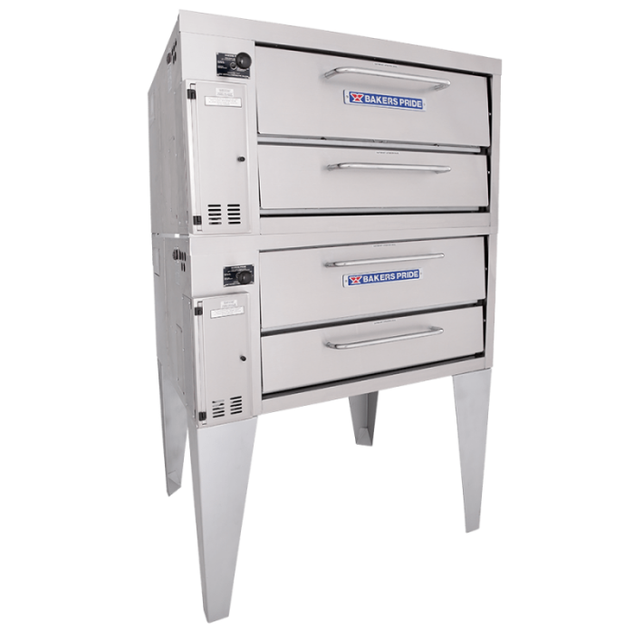 The Bakers PrideĀ® model 252 standard-depth double-stacked gas pizza oven is designed for all your high-volume baking needs. This double-stacked oven features two Cordierite decks with 8" deck heights and independently controlled top and bottom heat dampers for perfectly balanced results.This 48" wide model is constructed with heavy-duty angle iron frame, which is fully welded to allow for stacking. The oven exterior is heavy-duty stainless steel and fully insulated for cooler outer temperatures and consistent interior temperatures.