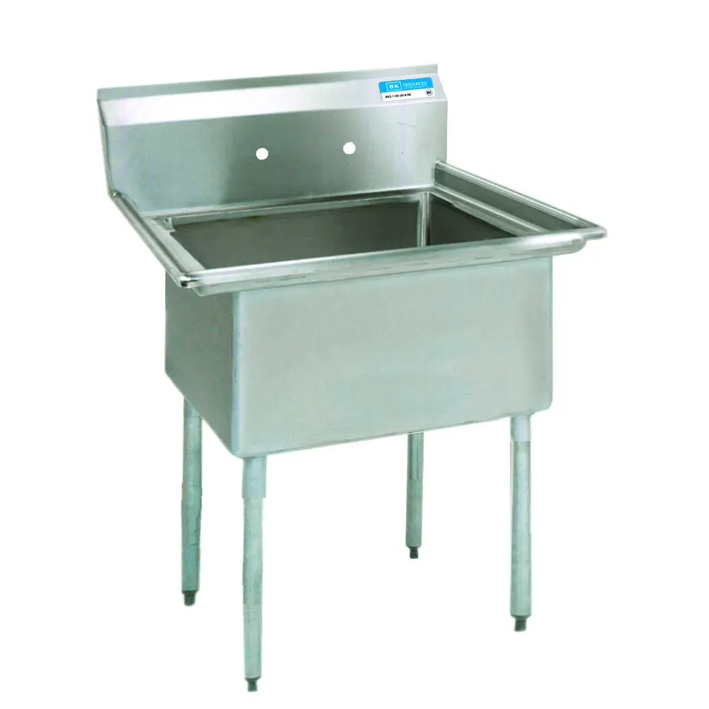 Introducing the BK Resources, BKS-1-15-14 Sink, (1) One Compartment - the perfect addition to any commercial restaurant kitchen. Craft culinary wonders with this high-quality sink that is designed to meet the demands of a busy kitchen. The sink features a spacious 15" wide x 15" front-to-back x 14" deep compartment, allowing you to easily wash and rinse large pots, pans, and dishes. The 9" backsplash and 8" OC splash mount faucet holes ensure a clean and organized workspace. Made from durable 18/304 stainless steel, this sink is built to withstand the rigors of a commercial kitchen. The rounded front and side edges provide added safety and the galvanized steel legs with adjustable high impact corrosion resistant feet offer stability and durability. NSF certified, this sink meets the highest standards of cleanliness and sanitation. Upgrade your kitchen with the BK Resources, BKS-1-15-14 Sink and experience the convenience and efficiency it brings to your culinary endeavors.