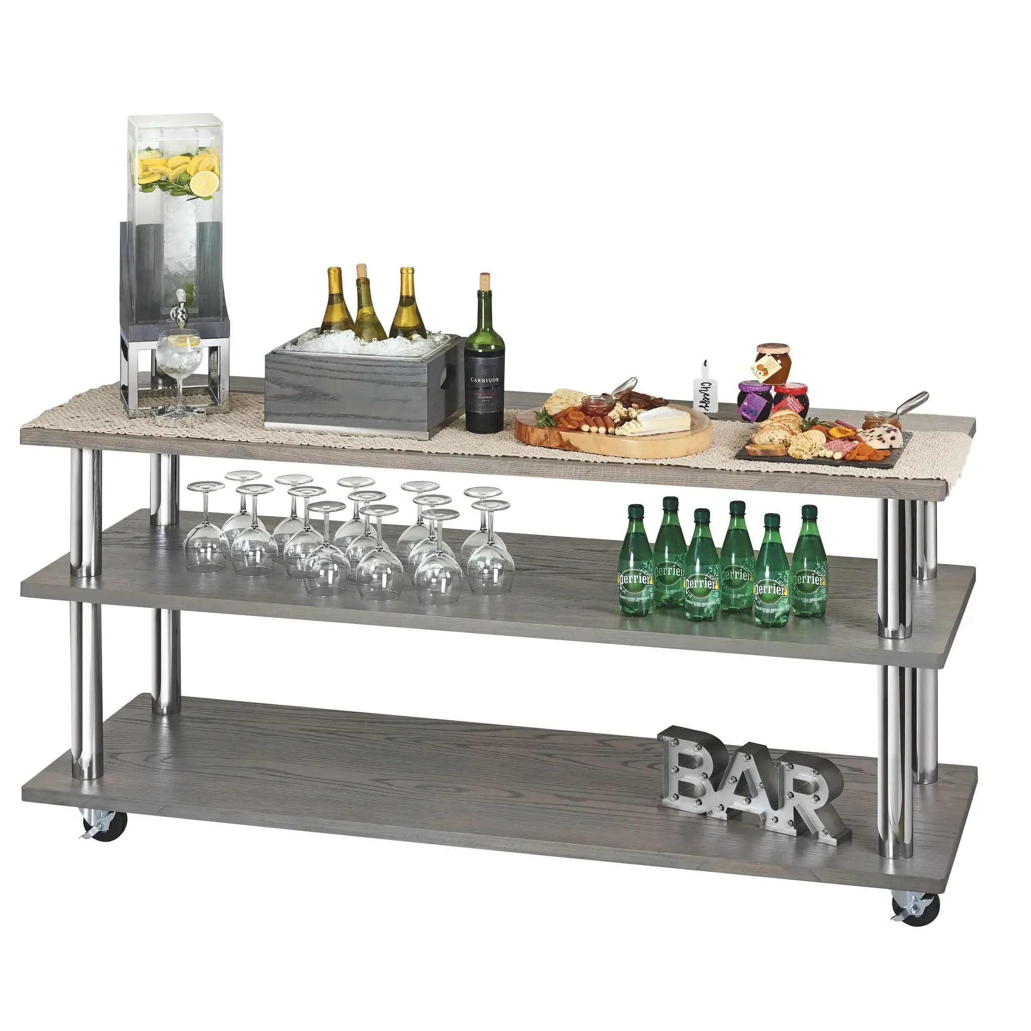 Set new standards in serving quality with the Cal-Mil, 3698-4-87 Cart. This versatile cart is designed to elevate your dining room service and display experience in a commercial restaurant setting. With its sleek Cinderwood U-Build design, this cart adds a touch of sophistication to any space. The three large dark ash gray oak wood shelves provide ample space for showcasing your culinary creations or displaying essential dining room items. The chrome support beams ensure stability and durability, while the four casters allow for easy mobility. Made from BPA-free materials, this cart prioritizes food safety. The accessory shelf, sold separately, offers additional storage options. Whether you're using it to transport dishes, serve drinks, or showcase desserts, the Cal-Mil Cart is a must-have for any restaurant looking to enhance its dining room service and display capabilities.