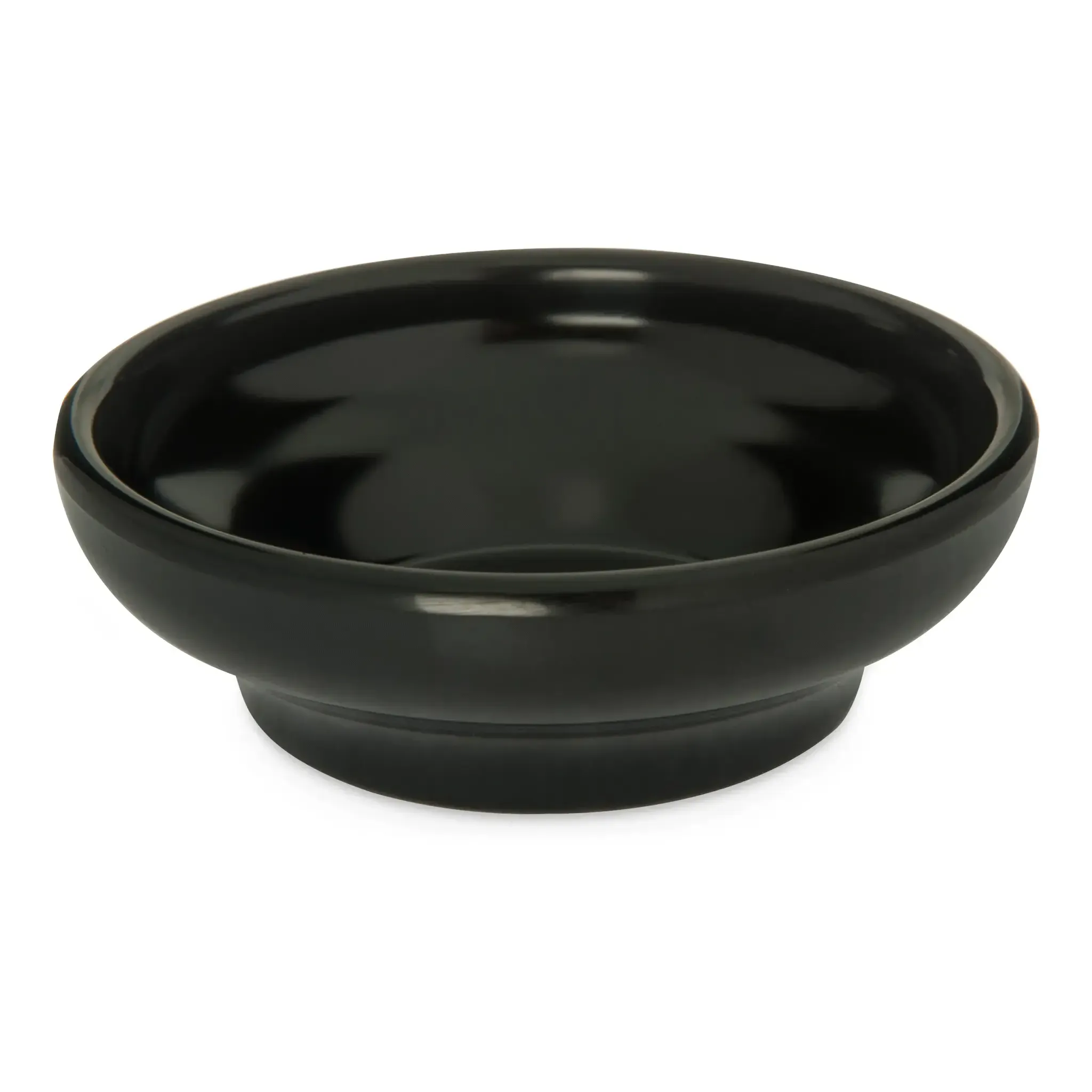 Elevate with top-notch kitchen tools. Introducing the Carlisle, 087503, Sauce Dish, Plastic. Designed for commercial restaurant use, this sauce dish is a must-have for any professional kitchen. Made of break-resistant melamine, it ensures durability and longevity, even in high-volume settings. The 5 oz. capacity and 4-1/8" diameter make it perfect for serving individual portions of salsa, sauces, or condiments. Its stackable design allows for easy storage, maximizing space efficiency. The dishwasher-safe feature ensures quick and hassle-free cleaning, saving valuable time and effort. With a sleek black color, this sauce dish adds a touch of elegance to any table setting. NSF certified, it meets the highest standards of safety and hygiene. Whether you're running a bustling restaurant or a busy catering service, the Carlisle Sauce Dish is the ideal choice for enhancing your culinary creations and impressing your customers.