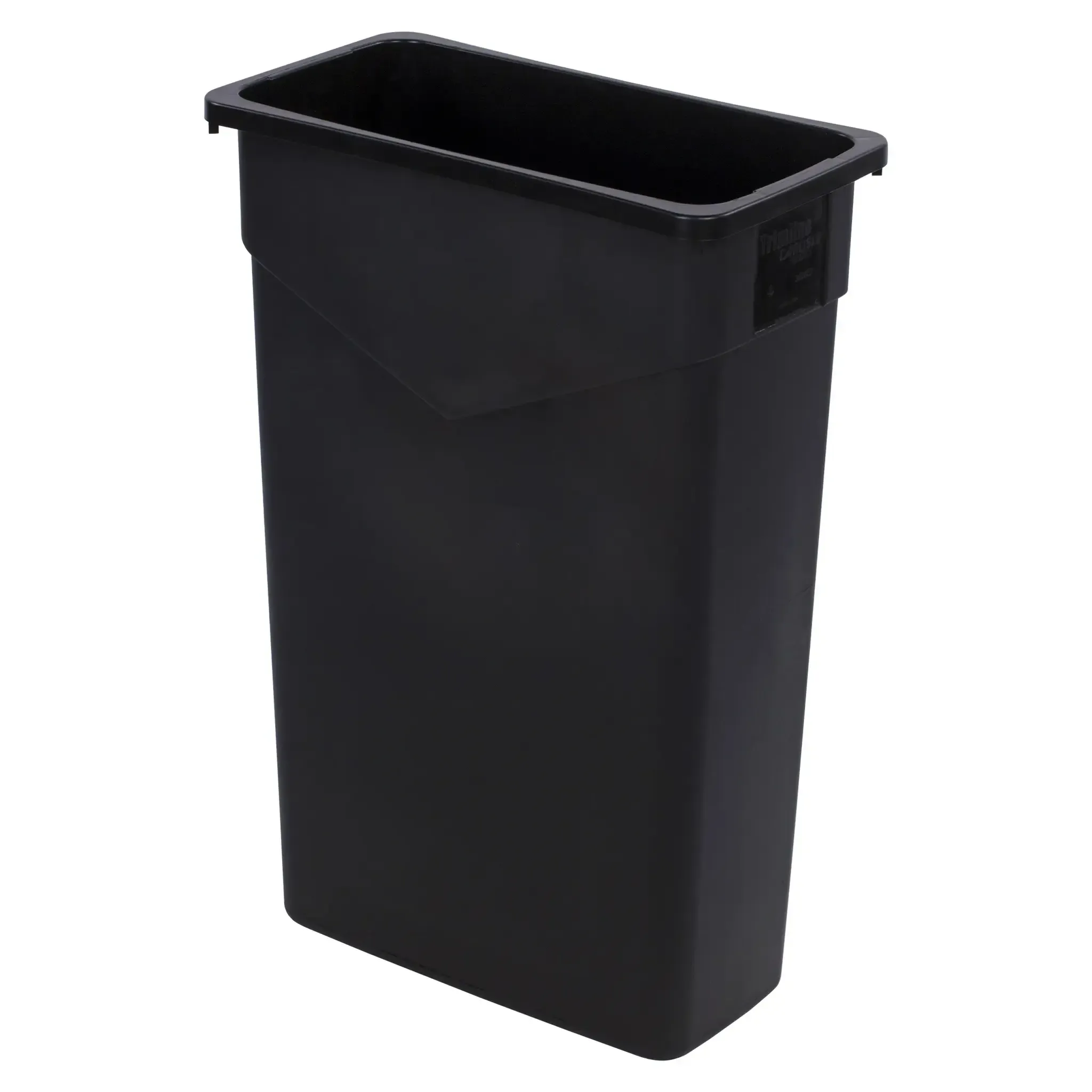 Introducing the Carlisle 34202303 Trash Receptacle, Indoor, designed to compete with superior utensils in commercial restaurant settings. This heavy-duty, 23-gallon waste container is a must-have for any bustling kitchen. Made from durable polyethylene, it can withstand the demands of a busy restaurant environment. The rectangular shape and integrated corner tabs allow for easy placement and space-saving storage. The bottom helper handles make it effortless to transport and empty, ensuring efficient waste management. With a sleek black design, this trash receptacle seamlessly blends into any restaurant decor. Carlisle, a trusted name in the industry, has packed this product with quality and functionality. Upgrade your restaurant's waste management system with the Carlisle 34202303 Trash Receptacle, Indoor, and experience the convenience and durability it brings to your establishment.
