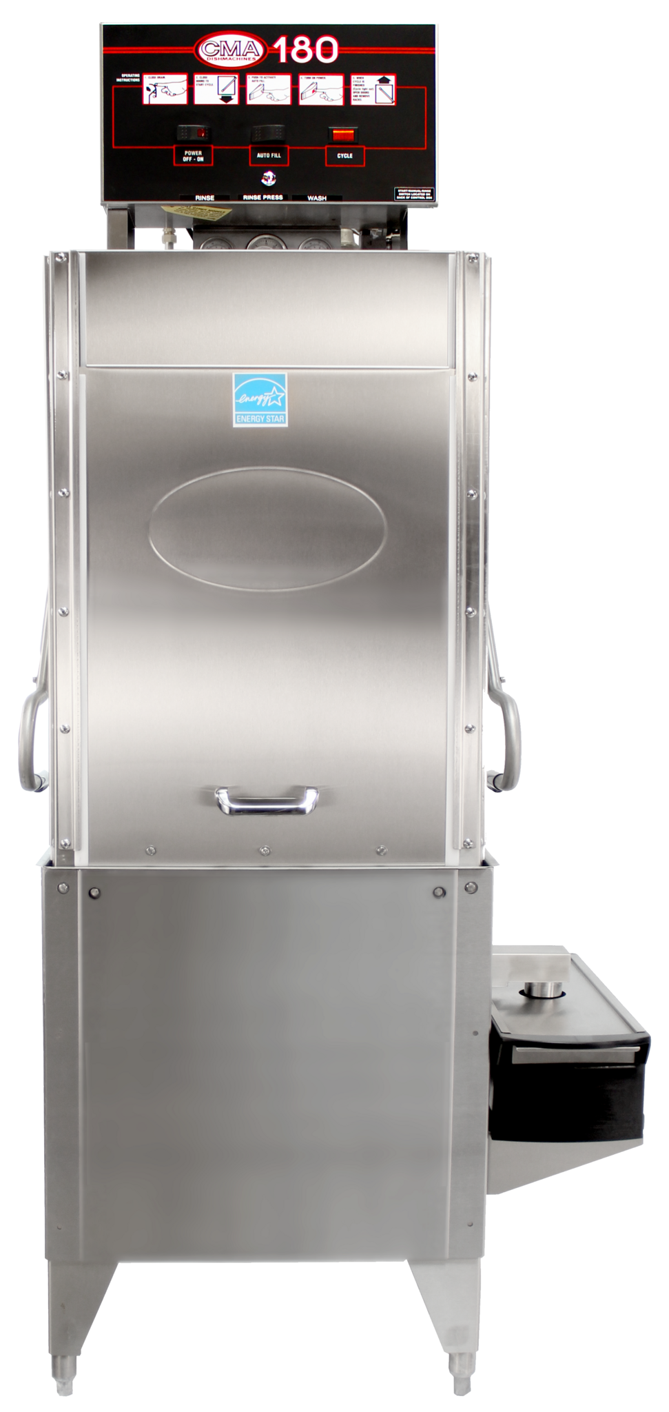 Achieve kitchen supremacy with the CMA Dishmachines, 180TallSB, Dishwasher, Door Type. This pot and pan dishwasher is designed to meet the demands of a busy commercial restaurant. With its high temperature sanitizing feature and built-in booster heater, it ensures that your dishes are thoroughly cleaned and sanitized. The straight-thru design and split-door feature provide ample dish clearance, making it easy to load and unload dishes. The automatic soil purging system and external Poly Pro scrap accumulator help to keep the dishwasher clean and free from debris. The interchangeable wash arms with a pull-pin design allow for easy maintenance and customization. Safety is also a priority with the Safety-Temp feature, ensuring that the water temperature is always at the optimal level. Made with stainless steel construction and a 1 HP wash pump, this dishwasher is built to last. NSF, UL, cULus, and ENERGY STAR certified, it meets the highest standards of quality and efficiency. Upgrade your restaurant's dishwashing capabilities with the CMA Dishmachines, 180TallSB, Dishwasher, Door Type.