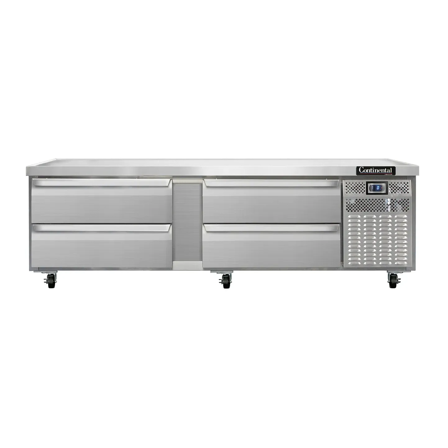 Fuel your restaurant's success with the Continental Refrigerator D84GFN Equipment Stand and Freezer Base. This two-section unit is designed to meet the demands of a busy commercial kitchen. With four drawers that can accommodate two 12" x 20" x 6" pans each, you'll have plenty of storage space for your ingredients. The stainless steel top features a drip guard marine edge, ensuring that any spills or messes are contained. Both the exterior and interior of the unit are made from durable stainless steel, making it easy to clean and maintain. The electronic control with digital display allows for precise temperature management, and the hi-low alarm and high/low temperature alarm ensure that your food stays at the optimal temperature. With self-contained refrigeration and a 1/2 HP compressor, this unit is both efficient and reliable. Made in the USA and certified by cETLus and NSF, you can trust the quality and safety of this equipment. Upgrade your kitchen with the Continental Refrigerator D84GFN Equipment Stand and Freezer Base.