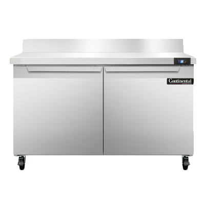 Elevate your cuisine with the Continental Refrigerator SW48NBS Refrigerated Counter. This work top refrigerator is designed to meet the demands of a commercial restaurant, offering a spacious 48"W and a generous 13.4 cu ft capacity. The stainless steel top with a 5-1/2"H backsplash provides a durable and easy-to-clean surface, perfect for food preparation. With two field rehingeable doors, you have easy access to your ingredients and supplies. The stainless steel front and end panels add a sleek and professional look to your kitchen. Inside, the aluminum interior ensures optimal temperature retention. The electronic control with a digital display allows for precise temperature adjustments, while the hi-low alarm alerts you of any temperature fluctuations. The rear mounted self-contained refrigeration system, powered by the eco-friendly R290 Hydrocarbon refrigerant, ensures efficient cooling. Made in the USA and certified by cETLus and NSF, this Continental Refrigerator is a reliable and high-quality addition to any commercial kitchen.