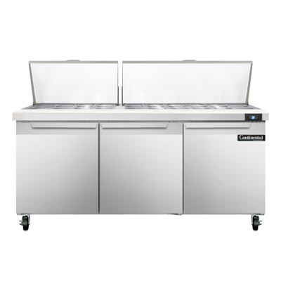 Introducing the Continental Refrigerator SW72N30M Refrigerated Counter, Mega Top Sandwich / Salad Unit. Dominate the culinary world with this powerful and versatile addition to your commercial kitchen. With a spacious 72" width and a generous 20.6 cu ft capacity, this three-section unit is perfect for busy restaurants and delis. It comes equipped with (30) 1/6 size x 4" deep pans and a convenient 10" cutting board, allowing you to easily prepare and assemble a wide variety of sandwiches and salads. The stainless steel top, front, and end panels ensure durability and easy cleaning, while the aluminum back and interior provide excellent insulation. The electronic control with a digital display allows for precise temperature management, and the hi-low alarm ensures food safety. With rear-mounted self-contained refrigeration and a 1/4 HP compressor, this unit is both efficient and reliable. Made in the USA and certified by cETLus and NSF, the Continental Refrigerator SW72N30M is the ultimate choice for commercial restaurant use.