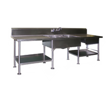 Embrace the future of technology and craftsmanship with the Eagle Group SMPT30120 Work Table with Prep Sink(s). This top-of-the-line prep table is designed specifically for commercial restaurant use, offering exceptional durability and functionality. The 14/304 stainless steel top and 10"H backsplash provide a hygienic and easy-to-clean surface, while the box marine edge on the front and sides ensures spill containment. The table features two 18"W x 24" front-to-back x 12" deep sink bowls with twist handle drains and overflow, making it perfect for food preparation and dishwashing tasks. The 8"OC splash mount T&S faucet allows for convenient water access. With a drawer, integrated pull flange, and 1/2" thick poly cutting board, this table offers ample storage and workspace. The 304 stainless steel undershelf with a rear up-turn provides additional storage options. The Uni-Lok gusset system and Z-clip wall mounting bracket ensure stability and easy installation. Complete with stainless steel legs and adjustable flanged feet, this work table is NSF certified and built to withstand the demands of a busy commercial kitchen. Upgrade your restaurant's efficiency and productivity with the Eagle Group SMPT30120 Work Table with Prep Sink(s).