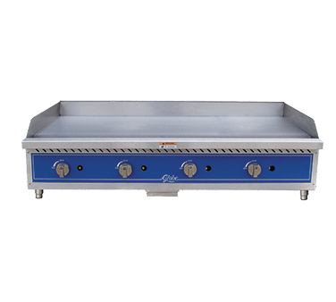 Introducing the Globe GG48G Gas Countertop Griddle, designed to drive restaurant profitability. This 48" wide griddle is a must-have for any commercial kitchen. Its 1" highly polished griddle plate is fully welded to a stainless steel frame, ensuring durability and even heat distribution. With manual controls every 12", you have precise control over the cooking process. The individual adjustable pilots with front access make ignition quick and easy. The 4" wide grease trough helps keep your cooking surface clean and the stainless steel double wall construction with an extended cool-to-touch front edge ensures safety. The GG48G is equipped with 4" adjustable heavy-duty stainless steel legs for stability and convenience. With a total BTU of 120,000, this griddle delivers powerful performance. It comes with a natural gas setup and includes an LP conversion kit. Upgrade your restaurant's cooking capabilities with the Globe GG48G Gas Countertop Griddle.
