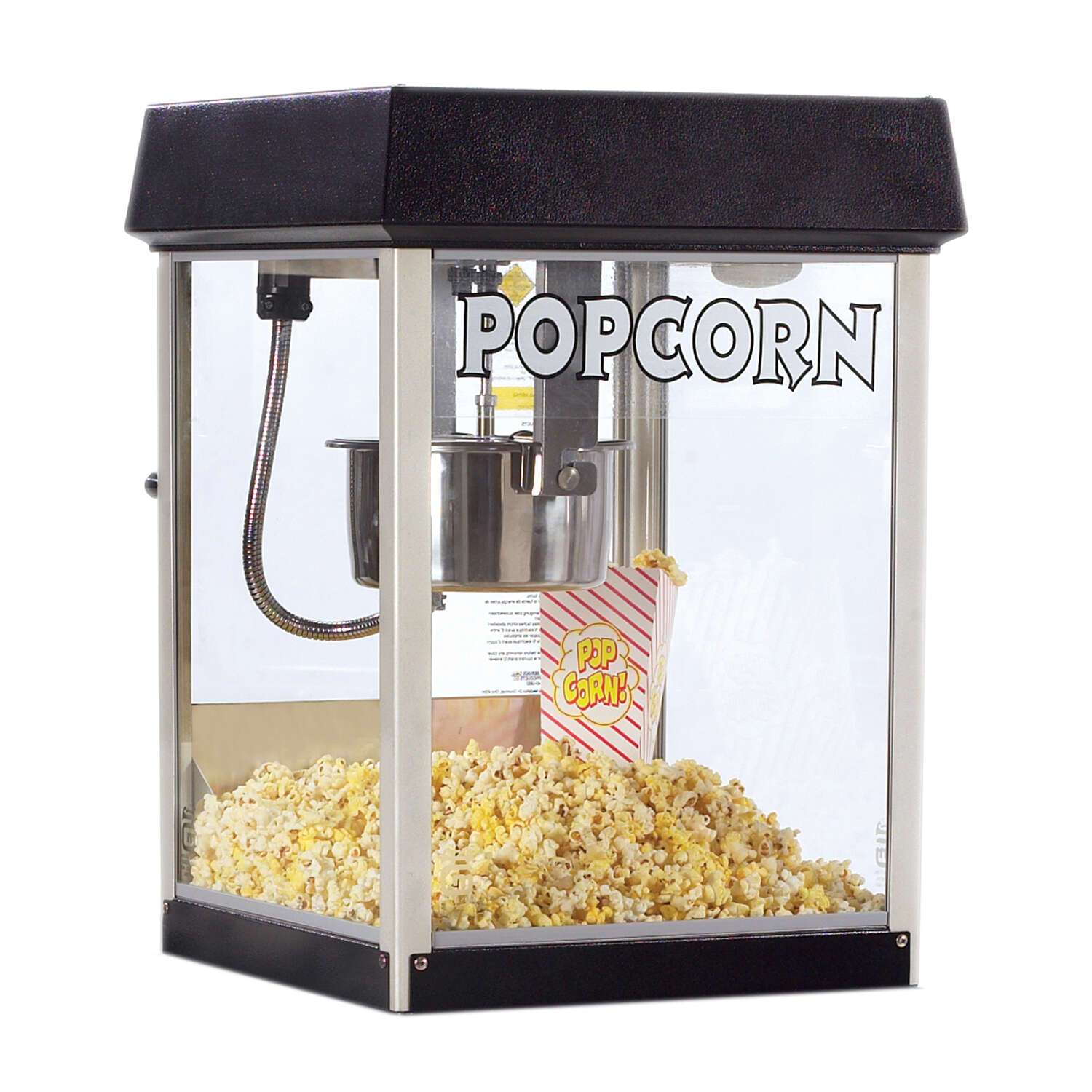 The tempered glass and heated corn deck are designed to keep your popcorn warm and fresh, providing your customers with a consistently delightful snacking experience. The tempered glass also adds a layer of safety and durability, making the Fun Pop 4 oz Midnight Popcorn Machine a reliable choice for high-traffic restaurant environments.