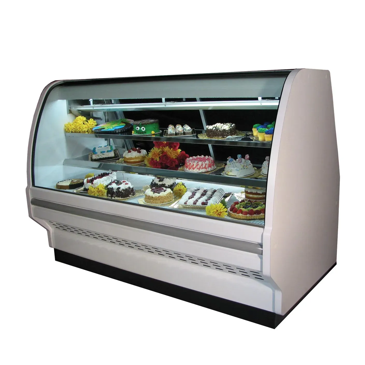 Serve with pride with the Howard-McCray R-CBS40E-8C-BE-LED Display Case, Refrigerated Bakery. This 99.5"W single duty case is designed to meet the needs of commercial restaurants, offering an endless design and double bend curved glass for an attractive display. The full length top gravity coil system ensures optimal cooling, while the two rows of lit glass shelving provide ample space to showcase your delicious baked goods. The black exterior and white interior create a sleek and modern look, complemented by the stainless steel top and rear doors for durability. The removable end panels make cleaning and maintenance a breeze. Designed for remote refrigeration, the R448A expansion valve is included for your convenience. With its reliable performance and UL certification, this refrigerated bakery case is a must-have for any commercial restaurant looking to showcase their baked creations in style.