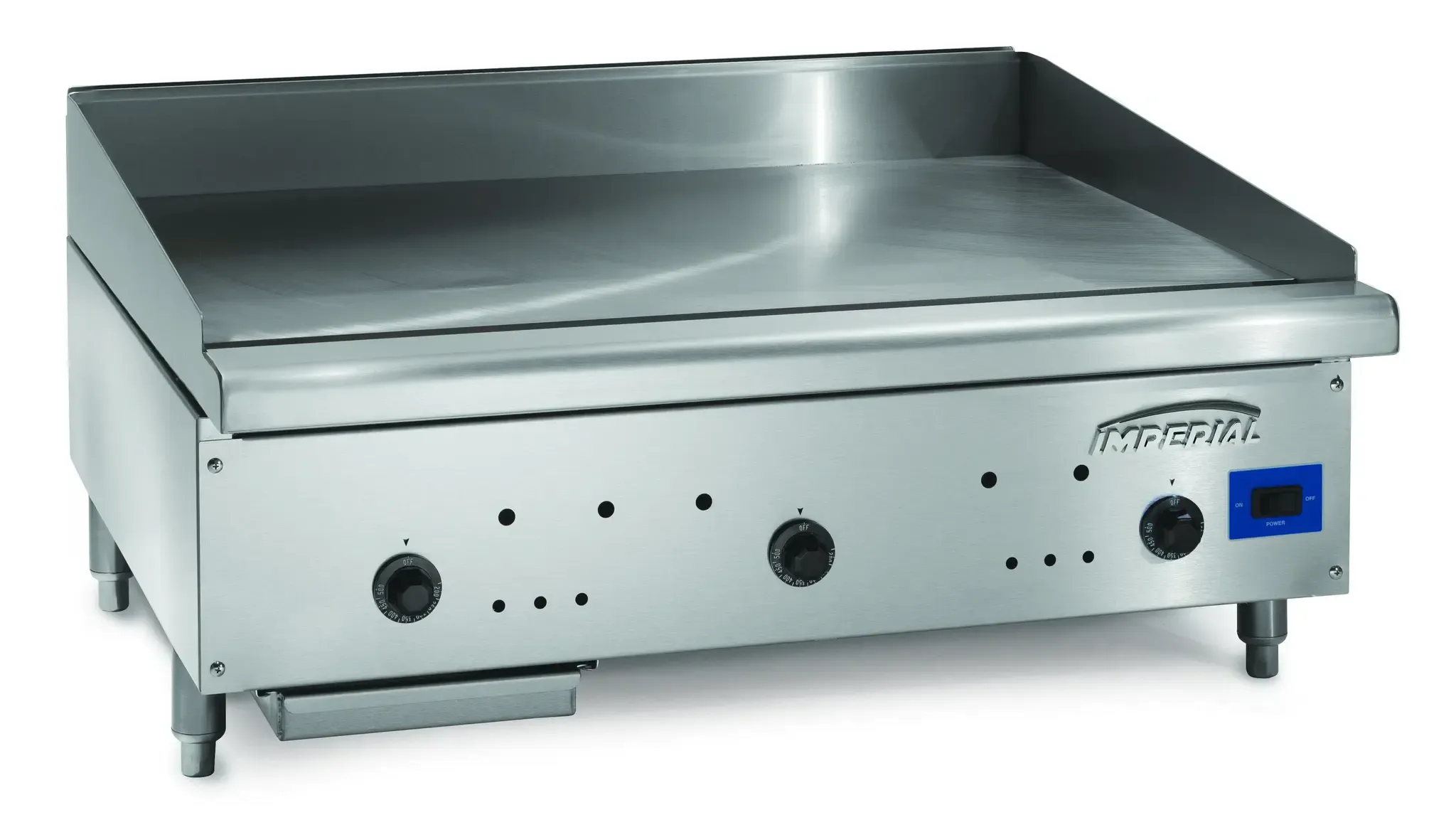 Boost your restaurant's performance with the Imperial ISAE-24 Gas Countertop Griddle. This high-quality griddle is designed to meet the demands of a busy commercial kitchen. With a 24" W x 24" D cooking surface and a 1" thick smooth steel plate, it provides ample space for cooking a variety of dishes. The snap action thermostat ensures precise temperature control, allowing you to achieve perfect results every time. The 4" wide grease gutter and removable grease can make cleaning up a breeze, while the stainless steel front, sides, ledge, and splash guards ensure durability and easy maintenance. The 4" legs provide stability, and the 6" cord and plug allow for easy installation. With a powerful 48000 BTU output, this griddle delivers exceptional performance. Trust Imperial, a reputable vendor in the industry, and invest in the ISAE-24 Gas Countertop Griddle to enhance your restaurant's efficiency and productivity.