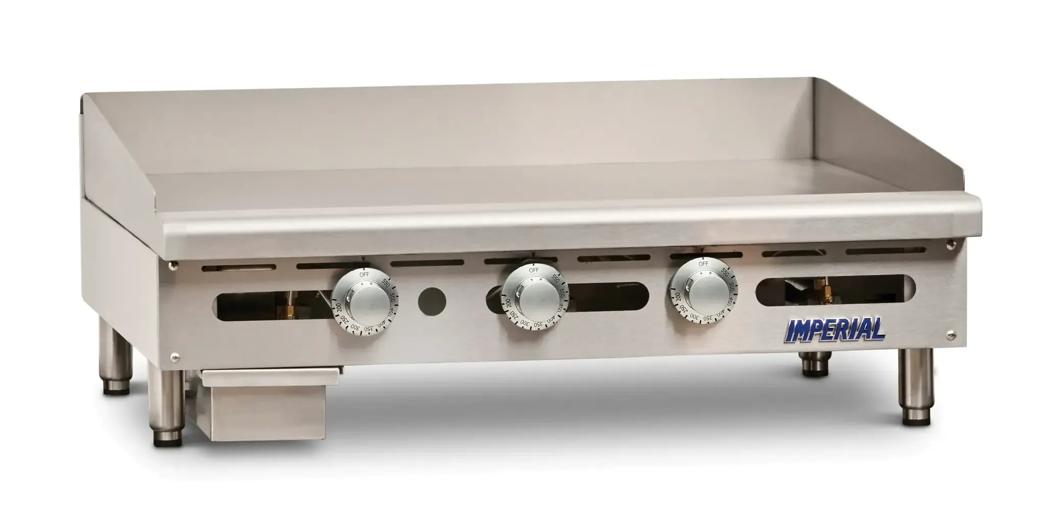 Introducing the Imperial ITG-36 Gas Countertop Griddle, a must-have for any commercial restaurant looking to drive profitability. With its 36" W x 24" D cooking surface and 1" thick polished steel plate, this griddle provides ample space and even heat distribution for cooking a variety of dishes. The thermostatic controls allow for precise temperature adjustments, ensuring consistent results every time. The 4" wide front grease trough and removable grease can make cleaning a breeze, while the stainless steel front, sides, splash guards, and ledge add durability and a sleek look to your kitchen. With 90,000 BTU of power, this griddle can handle high-volume cooking with ease. Certified by cETLus, NSF, and CE, you can trust the quality and safety of this Imperial griddle. Upgrade your restaurant's cooking capabilities with the Imperial ITG-36 Gas Countertop Griddle and watch your profits soar.