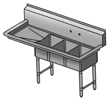Upgrade your restaurant workflow with the innovative Klingers Trading CON3DL Sink. This three-compartment convenience/deli sink is designed to enhance efficiency and productivity in commercial restaurant settings. Made from durable 18/304 stainless steel, this sink is built to withstand the demands of a busy kitchen. The three 10"W x 14" front-to-back x 10" deep compartments provide ample space for washing, rinsing, and sanitizing dishes, while the 8-1/2"H backsplash helps maintain a clean and hygienic environment. The sink also features a 12" left drainboard and three 3-1/2" drain baskets for easy disposal of waste. With its 8" OC splash mount faucet holes and stainless steel legs, crossbracing, and feet, this sink is NSF certified and meets the highest standards of quality and safety. Upgrade your restaurant's efficiency and cleanliness with the Klingers Trading CON3DL Sink.