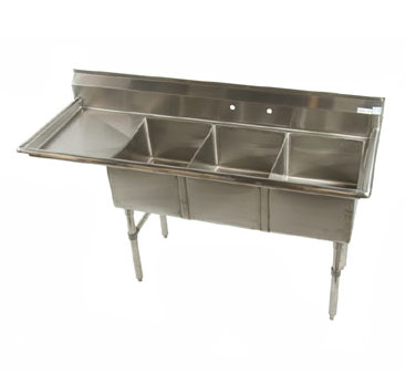 Enhance sustainability using practical alternative with Klingers Trading, ECS3DL24, Sink, (3) Three Compartment. This economy sink is designed for commercial restaurant use, offering durability and functionality. Made of 18/304 stainless steel, it ensures long-lasting performance in a busy kitchen environment. The sink features three 16"W x 20" front-to-back x 11" deep compartments, providing ample space for washing and rinsing dishes. With a 9"H backsplash and 24" left drainboard, it helps maintain a clean and organized workspace. The stainless steel gussets, legs, crossbracing, and adjustable bullet feet offer stability and support. The 8" O.C splash mount faucet holes allow for easy installation of faucets. NSF certified, this sink meets the highest standards of cleanliness and sanitation. Upgrade your restaurant's efficiency and hygiene with Klingers Trading, ECS3DL24, Sink, (3) Three Compartment.
