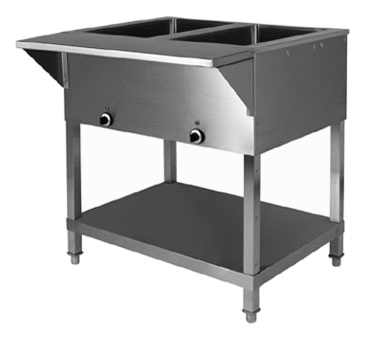 Modernize operations with the Klingers Trading SW2H120 Serving Counter. This electric hot food station is the smart choice for commercial restaurants looking to enhance efficiency and productivity. With its two 12" x 20" hot wells and individual thermostatic controls, you can easily keep different dishes at their optimal temperatures. The 18 gauge stainless steel undershelf provides durability and ample storage space for your kitchen essentials. The fiber glass insulation ensures energy efficiency, while the manifold drain assembly simplifies cleaning and maintenance. The 650 watts of power and 120v/60/1-ph, 20 amps electrical specifications guarantee reliable performance. Designed for convenience, this stationary table features a cord with NEMA 5-20P plug for easy installation. Trust Klingers Trading to deliver quality and functionality with the SW2H120 Serving Counter, perfect for modernizing your restaurant operations.