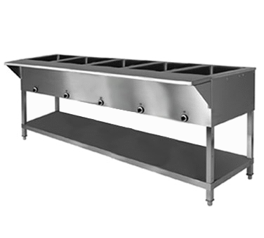 Revamp service with the Klingers Trading SW5H208 Serving Counter. This versatile electric table is designed for commercial restaurant use, offering a convenient and efficient way to keep your hot food items at the perfect temperature. With its 5-pan capacity and individual thermostatic controls, you can easily customize the heat settings for each well, ensuring that every dish is served just right. The 18-gauge stainless steel undershelf provides durability and ample storage space for your kitchen essentials. The fiber glass insulation and manifold drain assembly help maintain the temperature and keep your workspace clean and organized. With 825 watts of power and a cord with NEMA L6-30P, this serving counter is ready to handle the demands of a busy restaurant kitchen. Upgrade your food service operations with the Klingers Trading SW5H208 Serving Counter.
