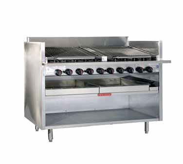 Achieve culinary excellence with the Magikitchn FM-RMB-636 Gas Floor Model Charbroiler. This top-of-the-line charbroiler is designed to meet the demands of a busy commercial restaurant kitchen. With its free-floating round rod top grate and EZ tilt to front grease trough, this charbroiler ensures even heat distribution and easy cleaning. The stainless steel radiants and 95% stainless steel construction make it durable and resistant to corrosion, perfect for a high-volume kitchen. The 6" service shelf with utility bar provides additional workspace, while the open cabinet base allows for convenient storage of cooking utensils and supplies. The 6" adjustable legs ensure stability and easy leveling on any surface. With its top grid scraper and water tubs, this charbroiler is a versatile and efficient addition to any commercial kitchen. Trust Magikitchn for quality and reliability in your restaurant operations.