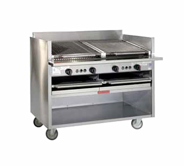 Enhance your commercial kitchen with the Magikitchn FM-SMB-660 Gas Floor Model Charbroiler. This 60" wide, 34" high charbroiler is designed to meet the demands of a busy restaurant kitchen. The free-floating round rod top grate with EZ tilt to front grease trough ensures even heat distribution and easy cleaning. The ceramic briquettes provide consistent heat and reduce flare-ups, while the 95% stainless steel construction ensures durability and longevity. The unit also features a 6" service shelf with a utility bar, water tubs for added moisture control, and an open cabinet base for convenient storage. With 6" adjustable legs and a top grid scraper, this charbroiler offers versatility and ease of use. Whether you're grilling steaks, burgers, or vegetables, the Magikitchn FM-SMB-660 Gas Floor Model Charbroiler is the perfect addition to any commercial restaurant kitchen.