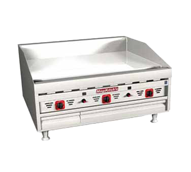 Unleash gastronomic brilliance with the Magikitchn MKG-36-E Gas Countertop Griddle. This high-quality griddle is designed to meet the demands of a busy commercial restaurant kitchen. With a spacious 35-3/4" W x 24" D cooking surface, you'll have plenty of room to cook multiple dishes at once. The 1" thick polished griddle plate ensures even heat distribution for perfect results every time. The electric thermostat with matchless ignition allows for precise temperature control, while the grease chute and box, along with the front grease trough, make cleaning up a breeze. The 3" side splash helps contain any splatters, keeping your kitchen clean and safe. Made of durable stainless steel, this griddle is built to withstand the rigors of a commercial kitchen. With 90000 BTU of power, this griddle can handle any cooking task. Trust Magikitchn for all your commercial griddle needs.
