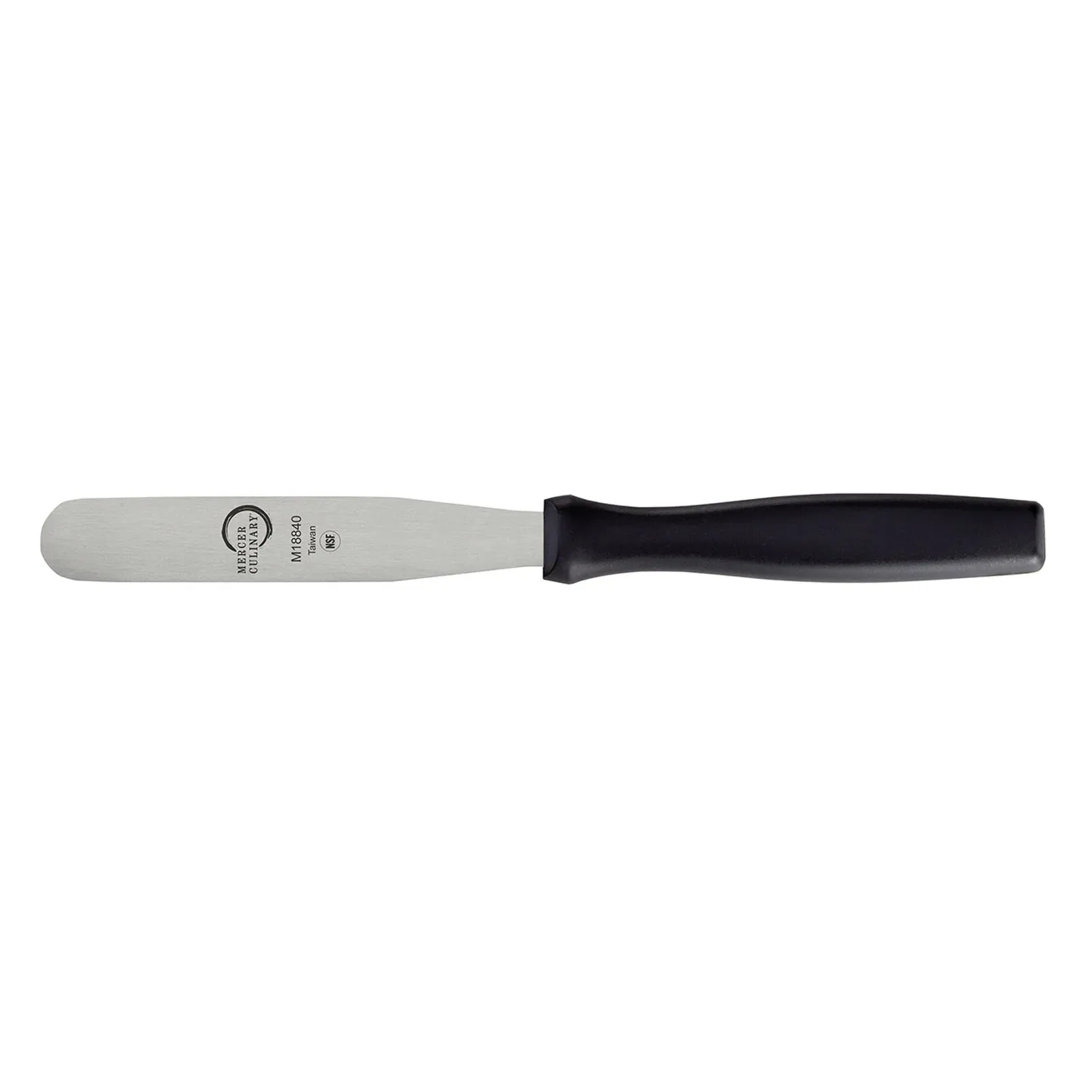 Maximize kitchen productivity with the Mercer Culinary, M18840P, Turner, Solid, Stainless Steel. This high-quality turner is designed for commercial restaurant use, offering exceptional durability and performance. The tapered ground stain-resistant stainless steel blade measures 4-1/4"L x 3/4"W, allowing for precise flipping and turning of food items. With an overall length of 9-1/4", this turner provides ample reach and control. The molded slip-resistant black polypropylene handle ensures a secure grip, even when working with greasy or wet ingredients. The self-adhesive hang tab label allows for easy storage and organization. Dishwasher safe and NSF certified, this turner is easy to clean and meets the highest standards of food safety. Whether you're flipping burgers on the grill or sauteing vegetables on the stovetop, the Mercer Culinary, M18840P, Turner, Solid, Stainless Steel is a must-have tool for any commercial kitchen.
