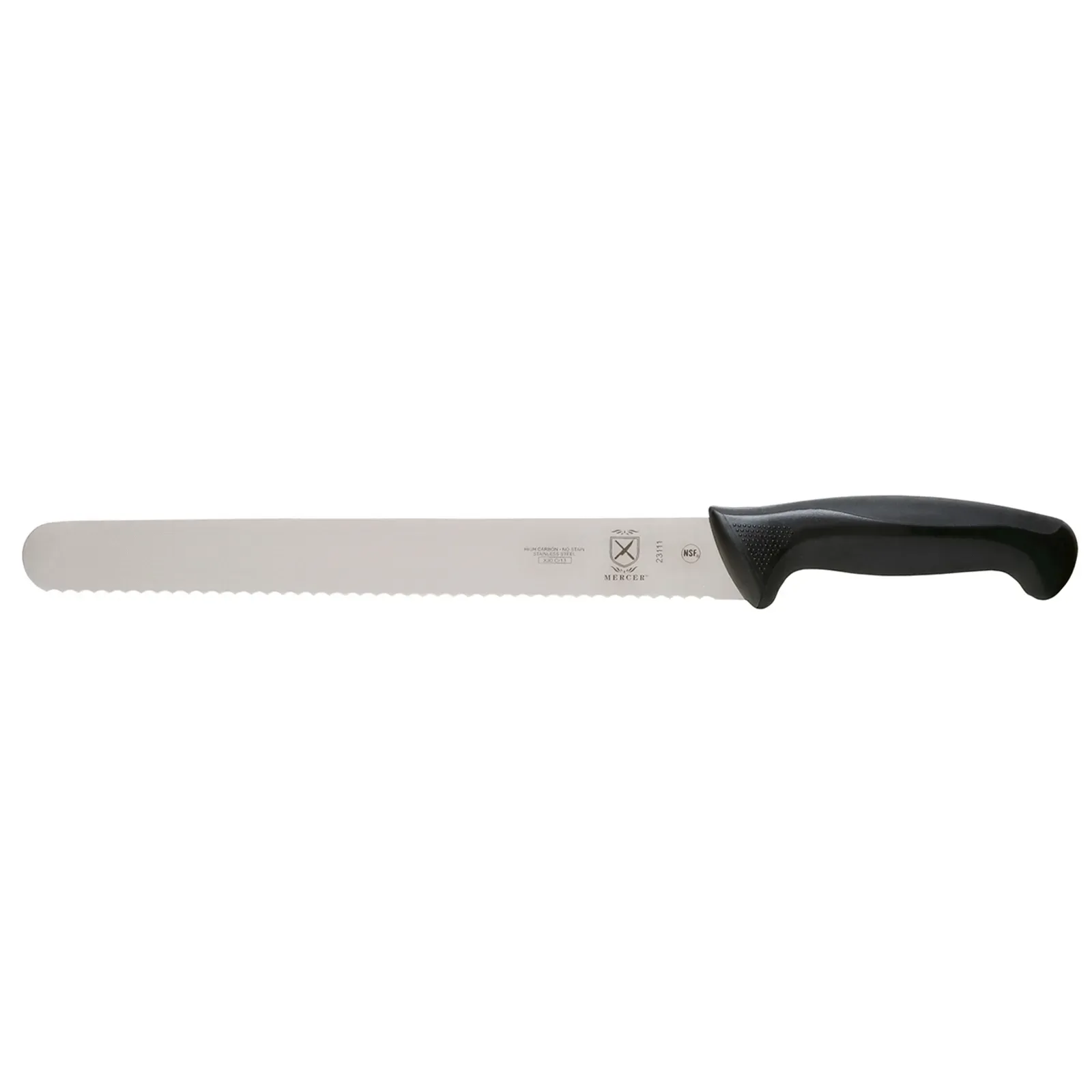 Elevate kitchen operations with the Mercer Culinary, M23111, Knife, Slicer. This 11" slicer with a wavy edge is designed to enhance precision and efficiency in a commercial restaurant setting. The high carbon, Japanese stain-resistant steel blade ensures long-lasting sharpness and durability, while the black non-slip Santoprene and polypropylene handle provides a secure grip even in busy kitchen environments. The textured finger points and protective finger guard offer added safety during use. With its NSF certification, this slicer meets the highest standards of quality and hygiene. Whether you're slicing meats, cheeses, or vegetables, this Mercer Culinary slicer is a reliable tool that will streamline your food preparation process. Trust in the quality and performance of Mercer Culinary for all your slicing needs.