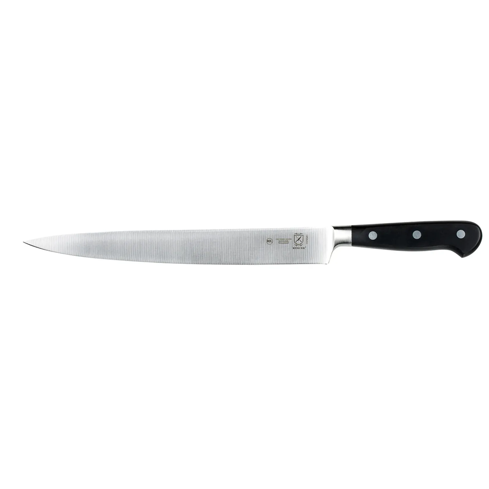 Elevate culinary experiences with the Mercer Culinary, M23580 Carving Knife. This 10" knife is designed to meet the demands of commercial restaurant use, making it an essential tool for any professional chef. The one-piece precision forged construction ensures durability and long-lasting performance, while the triple riveted handle provides a secure and comfortable grip. Made from high carbon, no-stain German steel, this knife delivers exceptional sharpness and precision for effortless carving. The ergonomic Delrin handle adds to the knife's comfort and control, reducing fatigue during extended use. With NSF certification, you can trust the quality and safety of this knife in your restaurant kitchen. Upgrade your carving game with the Mercer Culinary, M23580 Carving Knife and impress your customers with perfectly sliced meats and poultry.