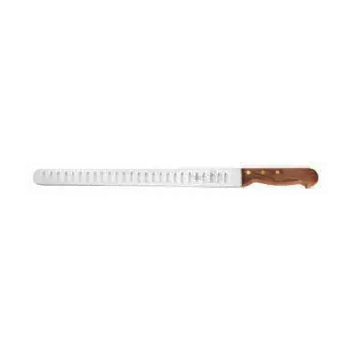 Boost culinary experiences with the Mercer Culinary, M26070, Knife, Slicer. This 12" slicer is designed to enhance efficiency and precision in commercial restaurant settings. The granton edge allows for smooth, effortless slicing of meats, cheeses, and vegetables, ensuring consistent and professional results every time. Crafted from high carbon, Japanese stainless steel, this one-piece, stamped knife offers exceptional durability and sharpness, making it a reliable tool for busy kitchens. The rosewood handle provides a comfortable grip, reducing fatigue during extended use. With three compression brass rivets, this slicer offers enhanced stability and longevity. Elevate your culinary creations with the Mercer Culinary, M26070, Knife, Slicer, and deliver exceptional quality and presentation to your customers.