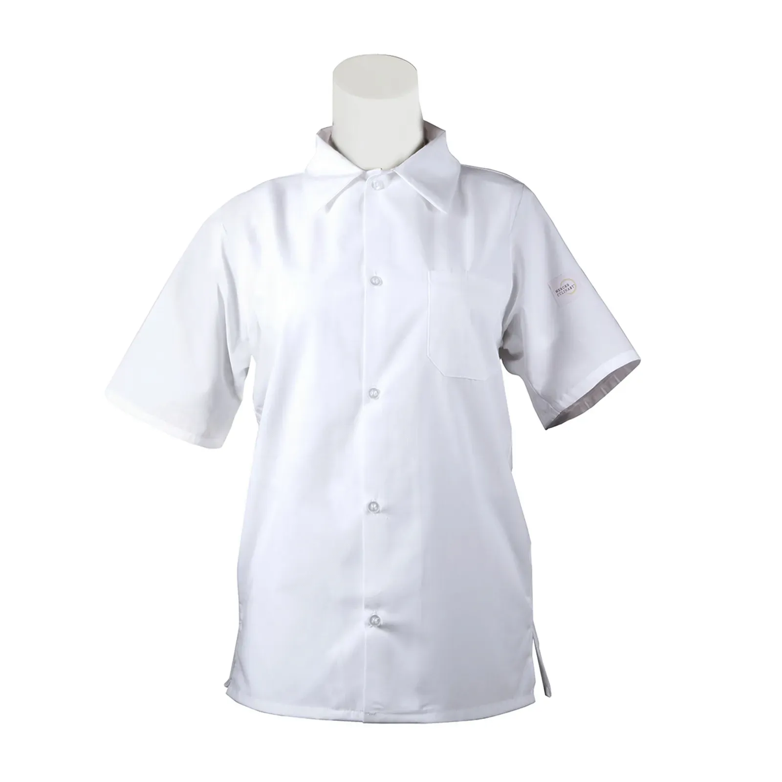 Optimize kitchen workflow with the Mercer Culinary, M60200WHL, Cook's Shirt. This unisex cook shirt from Mercer Culinary is designed to enhance comfort and functionality in a commercial restaurant setting. With its 65/35 poly/cotton poplin fabric, this shirt offers a perfect blend of durability and breathability. The mesh back and vented sides provide excellent ventilation, keeping you cool and comfortable during long shifts. The shirt features five traditional buttons for a classic look and a chest pocket for convenient storage of small essentials. Whether you're a chef, line cook, or kitchen staff, this cook shirt is a must-have for maintaining a professional appearance while ensuring maximum comfort. Elevate your restaurant's image with the Mercer Culinary, M60200WHL, Cook's Shirt.