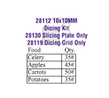 Equip your commercial kitchen with the Robot Coupe, 28112W, Food Processor, Disc Plate, Dicing. This high-quality food processor is a must-have for any restaurant looking to streamline their food preparation process. With its AA 10x10 Dicing Kit Series "D" Expert, this food processor allows you to dice ingredients quickly and efficiently, saving you valuable time in the kitchen. This food processor is designed specifically for commercial use, ensuring that it can withstand the demands of a busy restaurant kitchen. Whether you need to dice vegetables for a salad or prepare ingredients for a stir-fry, the Robot Coupe, 28112W, Food Processor, Disc Plate, Dicing is the perfect tool to help you get the job done quickly and efficiently. Upgrade your kitchen today and experience the convenience and efficiency of the Robot Coupe, 28112W.
