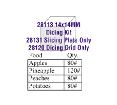 Realize kitchen dreams with the Robot Coupe, 28113W, Food Processor, Disc Plate, Dicing. This top-of-the-line food processor is a game-changer for commercial restaurants. With its powerful motor and expert dicing capabilities, it will revolutionize your food preparation process. The 28113W comes with a 14x14 Dicing Kit Series "D" Expert, allowing you to effortlessly dice vegetables, fruits, and more with precision and speed. Its compact design and durable construction make it perfect for busy restaurant kitchens, where efficiency and reliability are paramount. Whether you're preparing large quantities of ingredients for a busy dinner rush or creating intricate garnishes for a fine dining experience, this food processor has got you covered. Upgrade your kitchen with the Robot Coupe, 28113W, and take your culinary creations to the next level.