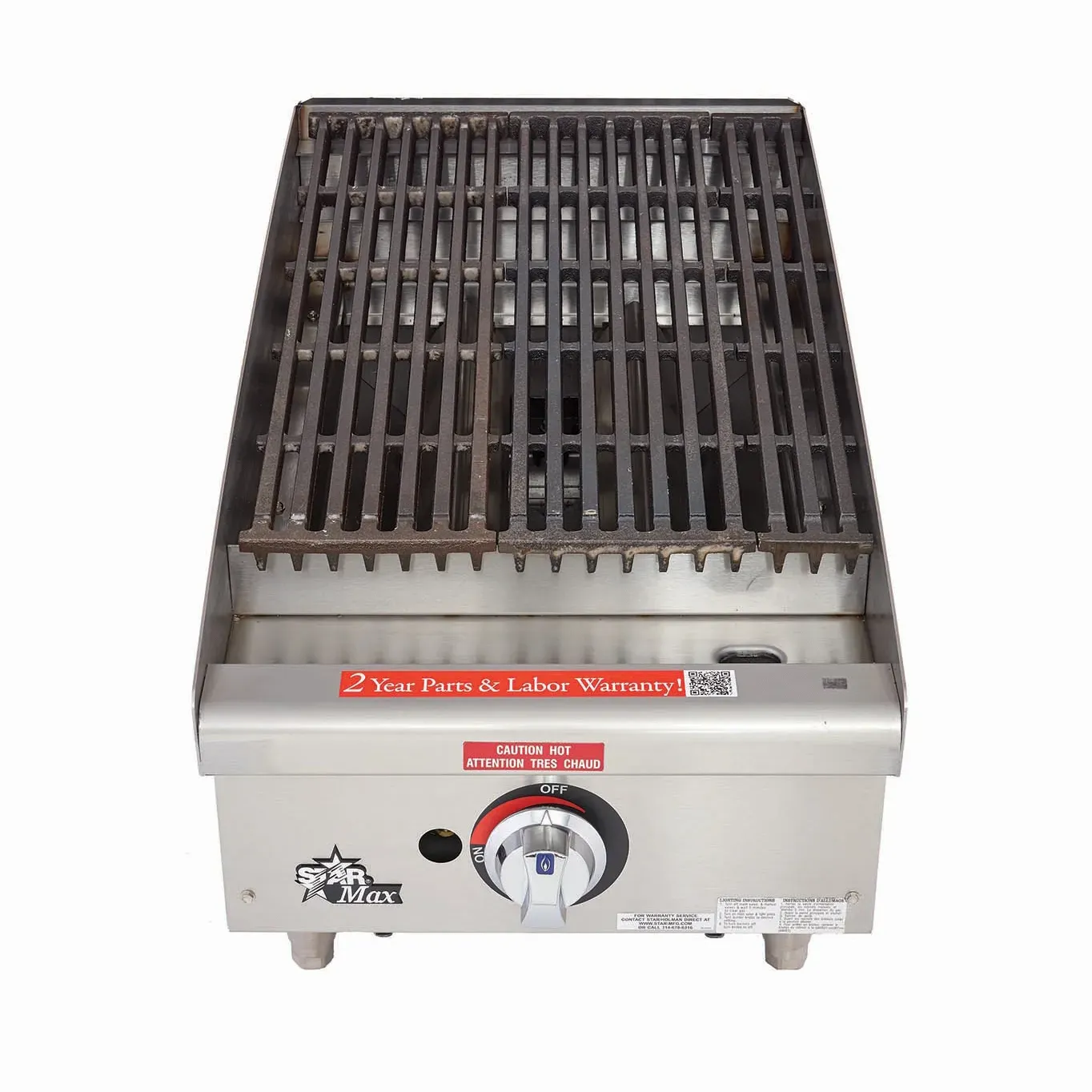 Achieve culinary excellence with the Star, 6115RCBF, Charbroiler, Gas, Countertop. This high-quality charbroiler from Star is designed to meet the demands of commercial restaurant kitchens. With its cast iron 40000 BTU burners and adjustable manual controls every 12 inches, you have precise control over the cooking process. The heavy stainless steel radiants ensure even heat distribution, while the cast iron broiling grates provide beautiful grill marks on your food. The welded steel frame with a stainless steel top and front, along with aluminized steel sides, make this charbroiler durable and easy to clean. It also comes with a stainless steel water pan, splash guard, and grease trough to keep your workspace clean and safe. With its 4-inch legs, this charbroiler is the perfect addition to any commercial kitchen. Trust Star to deliver exceptional performance and reliability.