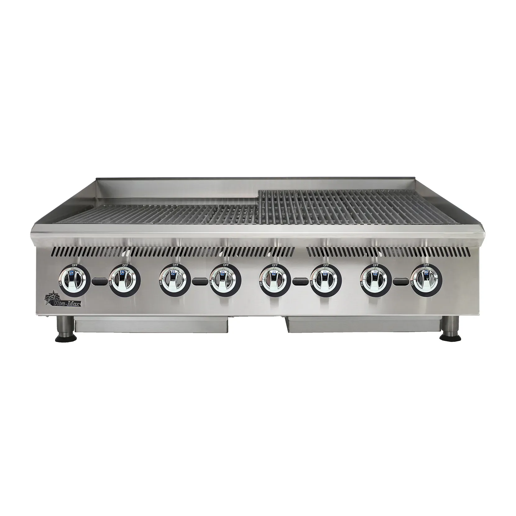 Introducing the Star 8148RCBB Gas Countertop Charbroiler, the perfect addition to any commercial restaurant kitchen. Designed to deliver food perfection, this charbroiler is a must-have for achieving that delicious, smoky flavor in your dishes. With its ultra-max design, this charbroiler provides ample cooking space, measuring 48"L x 35-1/5"D x 18"H. The adjustable manual controls, located every 6 inches, give you precise control over the cooking temperature, ensuring consistent results every time. The welded steel frame with a stainless steel exterior not only provides durability but also adds a sleek and professional look to your kitchen. The cast iron broiling grates, drip pan, splash guard, and grease trough make cleaning a breeze. With a powerful 160,000 BTU, this charbroiler can handle high-volume cooking with ease. Trust in the Star 8148RCBB Gas Countertop Charbroiler to elevate your restaurant's culinary offerings and impress your customers.