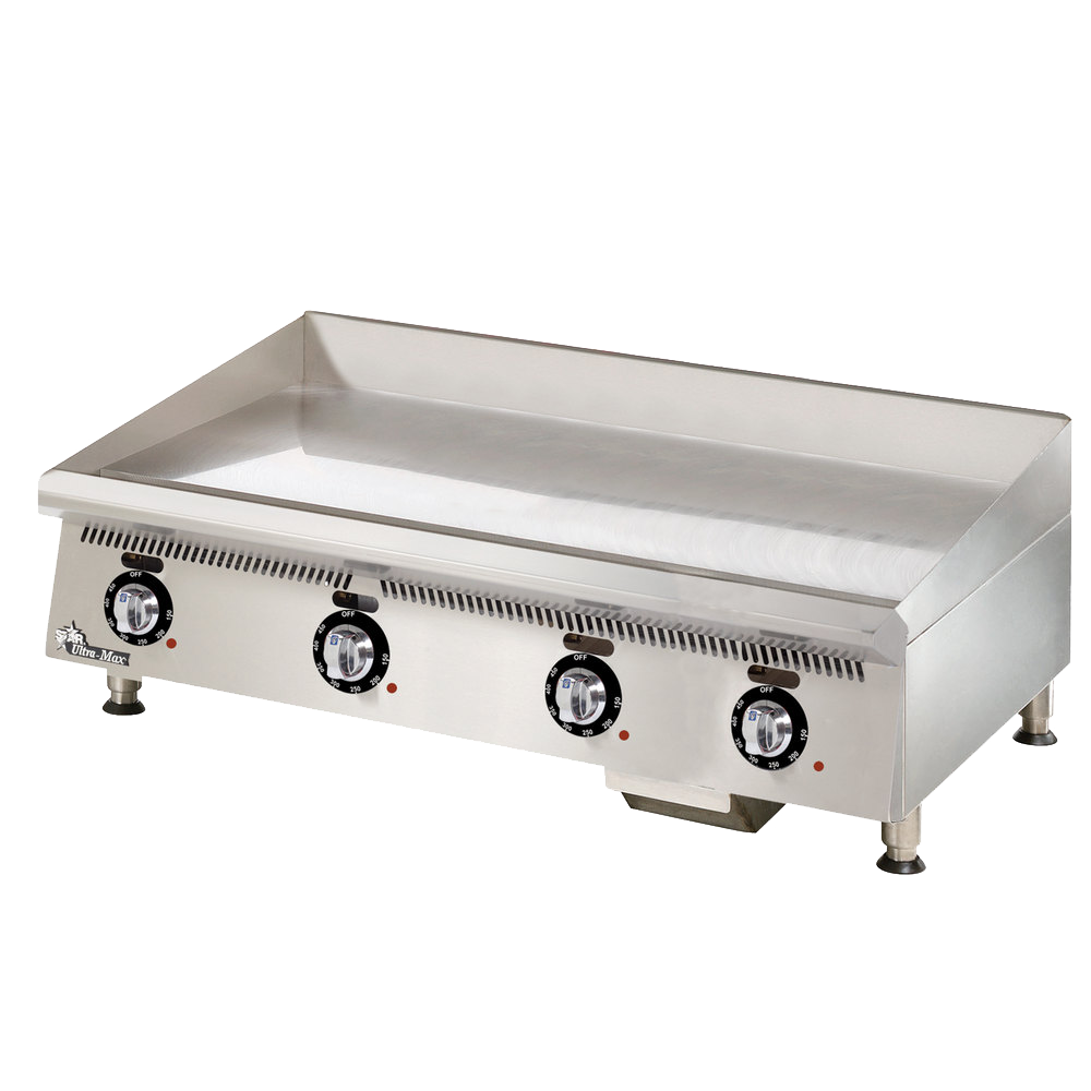 Streamline your restaurant cooking operations with the Star 848TCHSA Gas Countertop Griddle. This high-quality griddle is designed to meet the demands of a busy commercial kitchen. With a 48" wide by 24" deep cooking surface, it provides ample space to cook a variety of dishes simultaneously. The 1" thick T1 steel hexavalent chrome griddle plate ensures even heat distribution and excellent heat retention, while the embedded mechanical snap-action thermostat allows for precise temperature control from 150 to 550 degrees Fahrenheit. The griddle also features a tapered wrap-around splash guard and a front grease trough for easy cleaning and maintenance. Made in the USA with a welded steel frame and a stainless steel exterior, this griddle is built to last. The 120,000 BTU output ensures fast and efficient cooking, making it perfect for any commercial restaurant. Upgrade your kitchen with the Star 848TCHSA Gas Countertop Griddle and experience enhanced productivity and performance.