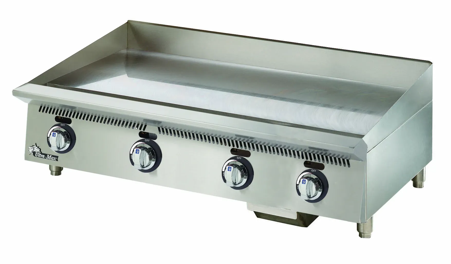 Ultra-Max® gas griddles are our highest performance griddle designed for high output and long life. For breakfast, lunch or dinner, the Ultra-Max griddles out-perform the competition. Ultra-Max® griddles features a 1” thick polished steel griddle plate, 30,000 BTU burners every 12″, and are available in 24”, 36”, 48”, 60″, and 72″ widths. Chrome plates are optional.