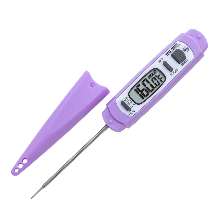 Optimize operations with the Taylor Precision 3519PRFDA Pocket Thermometer. This digital thermometer is designed specifically for commercial restaurant use, ensuring accurate temperature readings from -40°F to 450°F (-40°C to 230°C). The step-down probe, recommended by the FDA, allows for precise measurements, while the 1/2" digital display provides clear visibility. With a waterproof and easy-grip pen-style design, this thermometer is built to withstand the demands of a busy kitchen. The hold and auto-shut off features help conserve battery life, while the included LR44 battery ensures immediate use. Supporting allergy safety, this thermometer is an essential tool for maintaining food quality and preventing cross-contamination. Trust Taylor Precision for reliable and accurate temperature monitoring in your commercial kitchen.