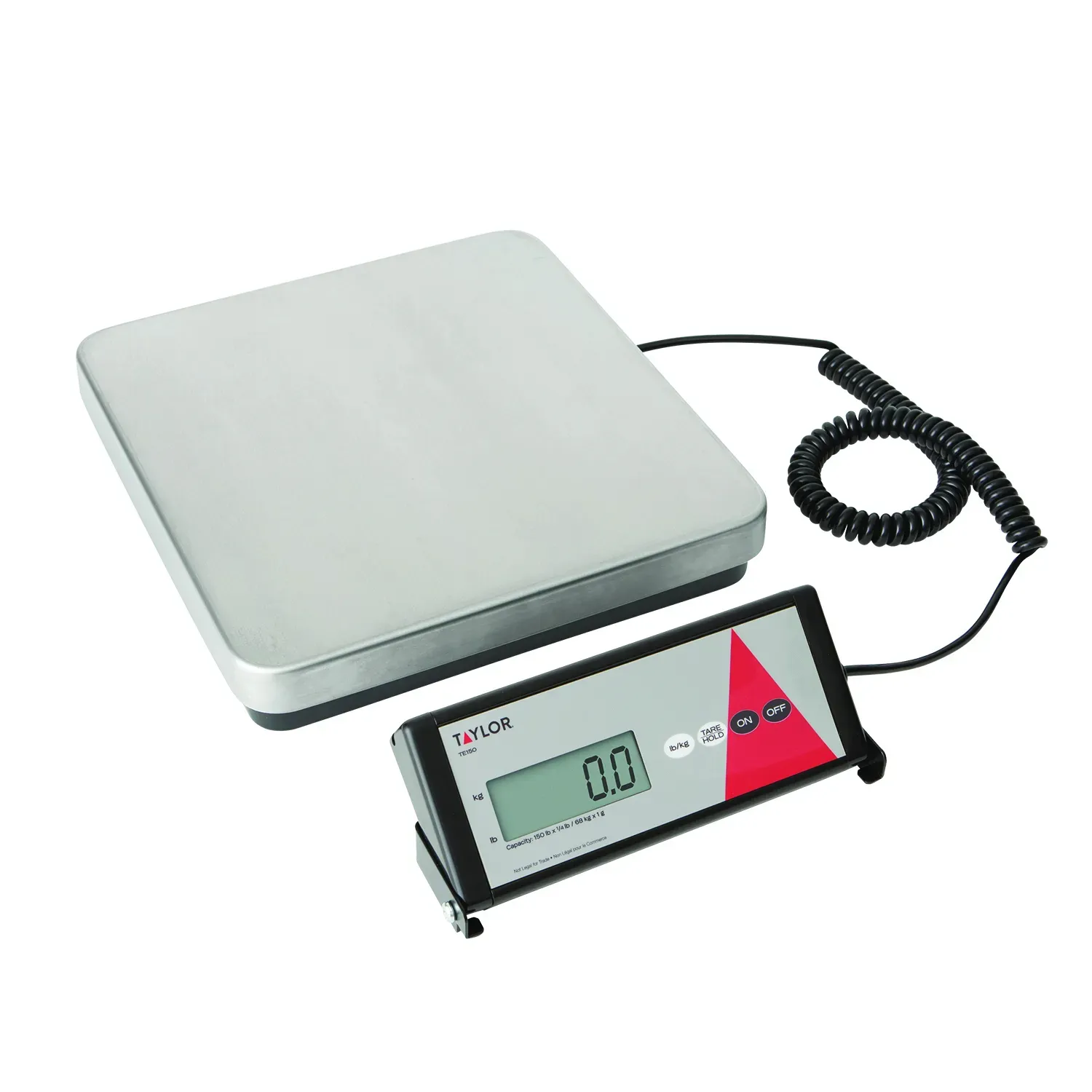 Upgrade kitchen precision with the Taylor Precision TE150 Scale. Designed for commercial restaurant use, this digital receiving scale offers a capacity of 150 lb x 1/4 lb (68 kg x 0.1 kg), ensuring accurate measurements for all your culinary needs. The removable stainless steel platform is easy to clean and maintain, while the tare, hold, and recalibration features provide added convenience. The 1" LCD remote display with a 6 ft. coiled cord and mounting bracket allows for easy visibility and accessibility. With dual power capacity, you can use the included 120v adaptor or 6 AA batteries (not included). The compact and low-profile design, along with non-skid feet, ensures stability and saves valuable counter space. Trust Taylor Precision for reliable and precise measurements in your commercial kitchen.