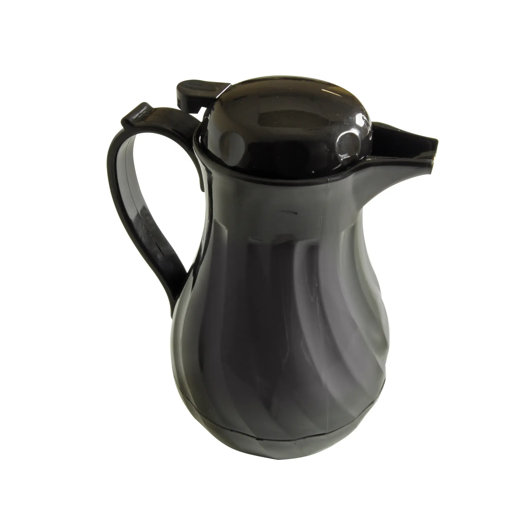 Upgrade solutions with the Thunder Group, PLWS042BK Beverage Server. This sleek and practical server is designed to enhance your commercial restaurant experience. With a generous capacity of 1.24 liters (42 oz.), it can accommodate a variety of beverages, keeping them hot or cold for extended periods thanks to its double wall insulation. The push button lid ensures easy pouring and prevents spills, while the swirl design adds a touch of elegance to your table setting. Made from break-resistant polycarbonate and polypropylene, this server is built to withstand the demands of a busy restaurant environment. It is also dishwasher safe, making cleanup a breeze