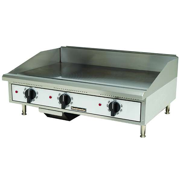 Optimize functionality with the Toastmaster TMGT36 Gas Countertop Griddle. Designed for commercial restaurant use, this griddle offers a spacious 36" W x 21" D cooking surface, allowing you to cook multiple items simultaneously. The 3/4" thick ultra-smooth polished steel plate ensures even heat distribution and excellent heat retention, while the three independent cooking zones provide versatility and efficiency. With thermostatic controls, you can easily adjust the temperature to suit different cooking needs. The front grease trough and chute, along with the side and rear splash guards, help keep your workspace clean and safe. This griddle is equipped with a pressure regulator and comes with a LP conversion kit, making it adaptable to your restaurant's gas supply. With its durable stainless steel construction and 4" nickel-plated steel legs, this Toastmaster griddle is built to withstand the demands of a busy commercial kitchen. Trust in its 60,000 BTU power and Made in USA quality to enhance your restaurant's cooking capabilities.