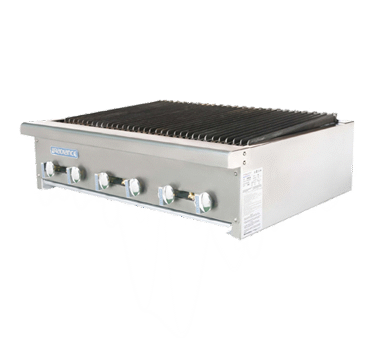 Ignite culinary passion with the Turbo Air TARB-36 Gas Countertop Charbroiler. This high-quality charbroiler is designed to meet the demands of a commercial restaurant kitchen. With its 16-gauge stainless steel front plate and wrap, it not only looks sleek but also ensures durability and longevity. The heavy-duty cast iron radiant and grates provide even heat distribution and excellent heat retention, allowing you to achieve perfect grill marks on your meats and vegetables. The six burners with manual controls give you precise control over the cooking temperature, while the removable grease pan makes cleaning a breeze. The bullnose stainless steel front extension adds a touch of elegance to your kitchen setup. With a total of 90,000 BTU, this charbroiler delivers powerful performance to meet the needs of a busy restaurant. Trust Turbo Air, a reputable vendor in the industry, to provide you with a reliable and efficient charbroiler for your commercial kitchen.