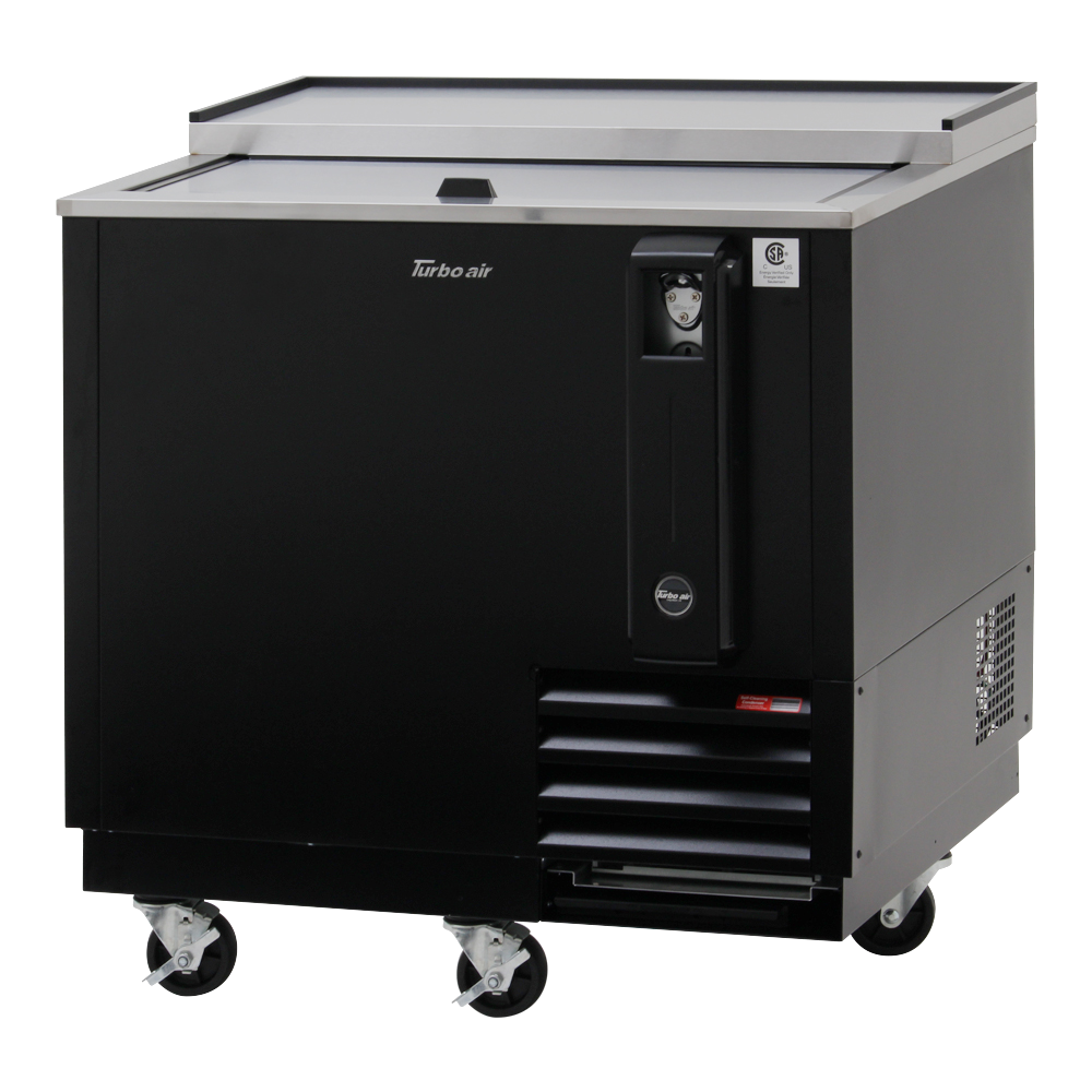 Cooking at its finest begins with the Turbo Air TBC-36SB-N6 Bottle Cooler. This sleek and efficient cooler is designed to meet the needs of commercial restaurants, ensuring that your beverages are always chilled and ready to serve. With a spacious 8.5 cu.ft. capacity and two PE coated adjustable dividers, you can easily organize and store a variety of bottles. The self-cleaning condenser equipped in this cooler ensures that it operates at peak performance, reducing the risk of breakdowns and extending the lifespan of the unit. The built-on removable bottle cap opener and catcher make it convenient for bartenders to quickly open and dispose of bottle caps. The sliding lid, stainless steel countertop, and lid add a touch of elegance to any bar setup. The black laminated exterior and stainless steel interior walls and floor not only provide durability but also make cleaning a breeze. The galvanized steel interior top and side mount compressor further enhance the longevity of the cooler. With front breathing and five casters, this cooler can be easily moved and positioned wherever it's needed. The Turbo Air TBC-36SB-N6 Bottle Cooler uses R600a Hydrocarbon refrigerant, which is not only environmentally friendly but also ensures efficient cooling. With a 1/8 HP compressor and 1.6 amps, this cooler is energy-efficient and cost-effective. The cord and NEMA 5-15P plug make installation a breeze. This cooler is cETLus and ETL-Sanitation certified, guaranteeing its safety and reliability. Upgrade your restaurant's beverage service with the Turbo Air TBC-36SB-N6 Bottle Cooler.