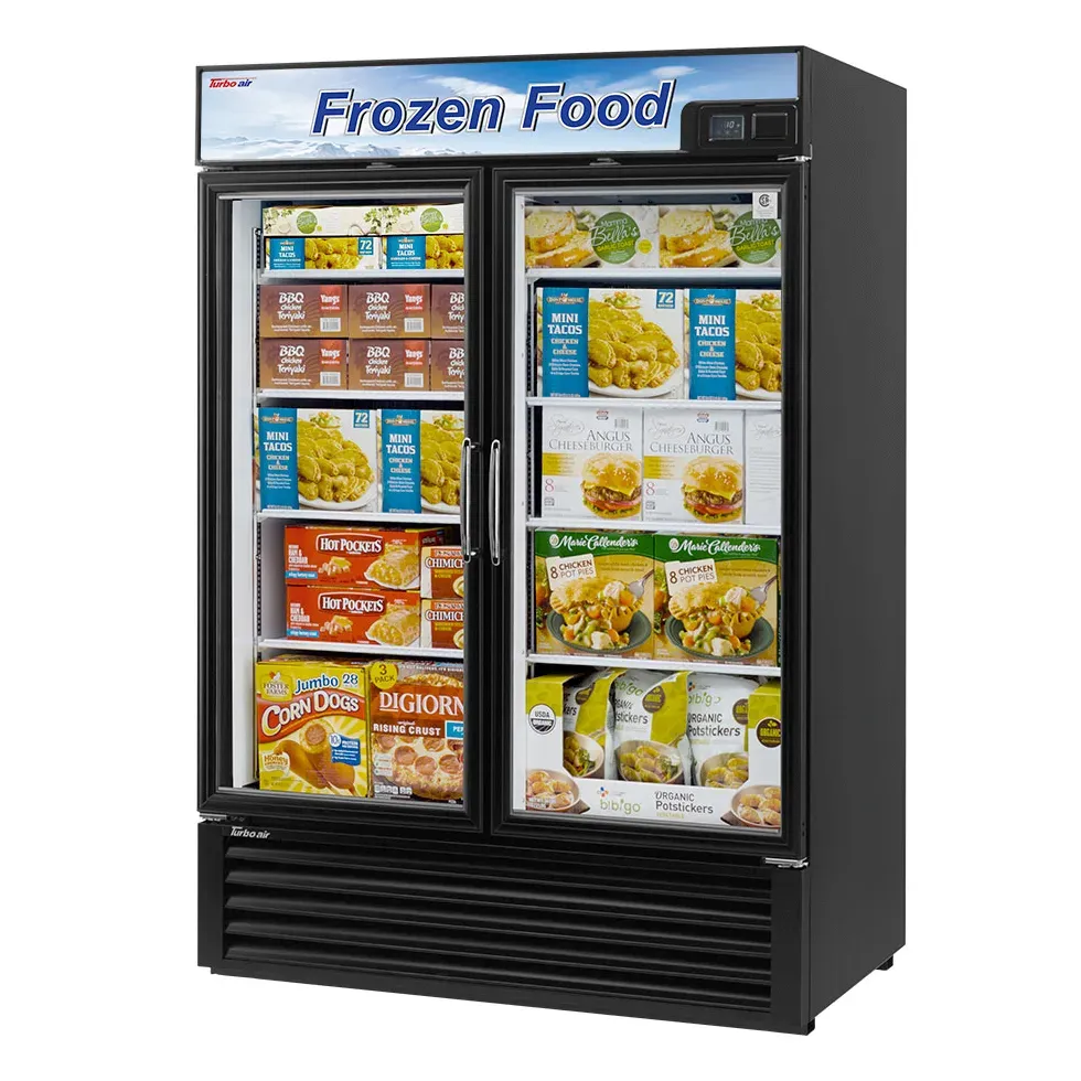 Enhance the heart of your restaurant with the Turbo Air TGF-49FB-N Freezer Merchandiser. This two-section freezer is designed to meet the demands of a busy commercial kitchen. With a spacious 39.88 cu. ft. capacity, it provides ample storage space for all your frozen goods. The two triple pane heated glass doors not only showcase your products but also help to maintain the ideal temperature inside. The LED lighting illuminates the interior, making it easy to find what you need. The eight adjustable PE coated wire shelves allow for flexible storage options, while the digital temperature controller ensures precise temperature control. The self-diagnostic monitoring system and door opening alarm provide added convenience and peace of mind. With features like Turbo freezing and smart fuzzy defrosting, this freezer merchandiser is a reliable and efficient choice for any commercial restaurant. The black exterior and bottom mount compressor add a sleek and professional look to your establishment. Trust Turbo Air to deliver high-quality and durable equipment for your restaurant needs.