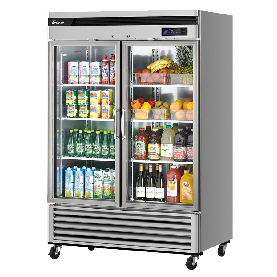 Boost your restaurant's performance with the Turbo Air TSR-49GSD-N Refrigerator Merchandiser. This super deluxe glass door refrigerator is designed to meet the demands of a busy commercial kitchen. With a spacious two-section design and a capacity of 44.14 cu. ft., it provides ample storage space for all your ingredients and beverages. The self-contained and self-cleaning condenser device ensures optimal performance and reduces maintenance needs. The front aluminum door frame and stainless steel construction make it durable and easy to clean. The hinged double pane glass doors with Low-E glass not only provide a clear view of the contents but also help to conserve energy. LED interior lighting illuminates the interior, making it easy to find what you need. The six PE coated wire shelves offer flexible storage options, and the LED digital thermometer allows for precise temperature control. With features like door open beep, self-diagnostic monitoring system, and turbo cooling, this refrigerator merchandiser ensures food safety and efficiency. The automatic fan motor delays and door locks add an extra layer of convenience and security. The bottom mount compressor and R290 Hydrocarbon refrigerant ensure energy efficiency and environmental friendliness. This refrigerator merchandiser operates on 1/3 HP and 115v/60/1-ph, making it suitable for most commercial kitchens. It is also ENERGY STAR certified, guaranteeing energy savings and sustainability. Trust Turbo Air, a reputable vendor in the industry, to provide you with a high-quality and reliable refrigeration solution.