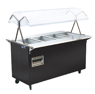 Serve with pride with the Vollrath, 38712, Serving Counter, Hot Food, Electric. This affordable portable hot food station is perfect for commercial restaurant use. With its four wells, it provides ample space to keep your food warm and ready to serve. The buffet-style breath guard ensures that your food stays fresh and protected. The enclosed base with sliding doors offers convenient storage for your supplies and equipment. The manual control for each 525-watt well allows you to easily adjust the temperature to suit your needs. The black vinyl-clad 20-gauge carbon steel base not only looks sleek but also ensures durability and longevity. With four 4" swivel casters, including two braked ones, this serving counter is easy to move around your restaurant. Made in the USA and NSF certified, this Vollrath serving counter is a reliable and high-quality addition to any commercial kitchen.