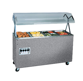 Fuel your restaurant's success with the Vollrath 38728464 Serving Counter. This affordable portable hot food station is a must-have for any commercial restaurant. With three wells, measuring 46"W x 28-5/8"D x 57-5/16"H overall, this buffet-style counter provides ample space for serving a variety of hot dishes. The included breath guard with lights adds an elegant touch to your presentation, while the enclosed base with storage opening keeps your supplies organized and easily accessible. Each 700-watt well has manual control, allowing you to adjust the temperature to suit your needs. The granite vinyl-clad 20 gauge carbon steel base is not only durable but also adds a touch of sophistication to your establishment. With four 4" swivel casters, two of which are braked, this serving counter is easy to maneuver and secure in place. Powered by 120/208-240v/60/1-ph and 13 amps, this counter is designed to meet the demands of a busy restaurant kitchen. Trust Vollrath, a reputable brand known for its quality and reliability. Invest in the Vollrath 38728464 Serving Counter and elevate your restaurant's food service to the next level.