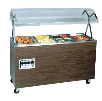Ignite culinary passion with the Vollrath, 387692, Serving Counter, Hot Food, Electric. This affordable portable hot food station is a must-have for any commercial restaurant. With its three wells and buffet-style breath guard, it provides ample space for keeping your dishes warm and ready to serve. The enclosed base with sliding doors offers convenient storage for your supplies, while the cherry woodgrain vinyl-clad carbon steel base adds a touch of elegance to your establishment. Each well has manual control for precise temperature settings, ensuring that your food stays at the perfect temperature. The four swivel casters, two of which are braked, make it easy to move the station wherever it's needed. Made in the USA and certified by cULus and NSF, this serving counter is built to last and meets the highest standards of quality and safety. Upgrade your restaurant's food service capabilities with the Vollrath, 387692, Serving Counter, Hot Food, Electric.