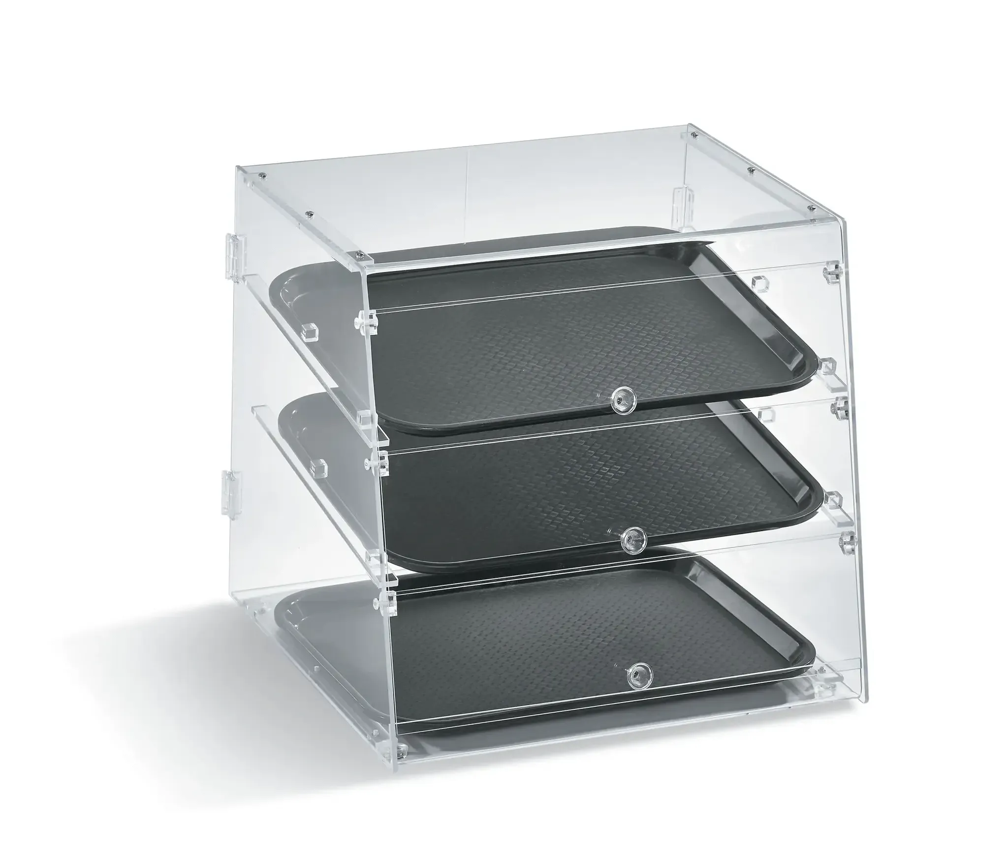 The Vollrath® 3-tier knockdown baked goods display case beautifully displays your baked goods. Made of clear acrylic, this countertop case assembles in minutes and ensures great product visibility. Each of the three tiers has a black tray and individual doors. The self-closing doors allow easy access while acting as a sneeze guard to maintain sanitation. With front doors providing self-serve convenience and rear doors ensure quick restocking, this display case is the ideal choice for your baked goods display.